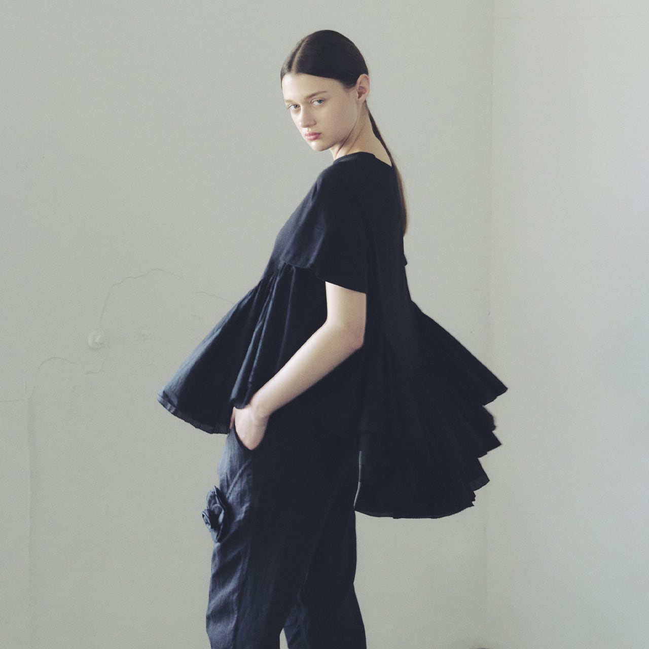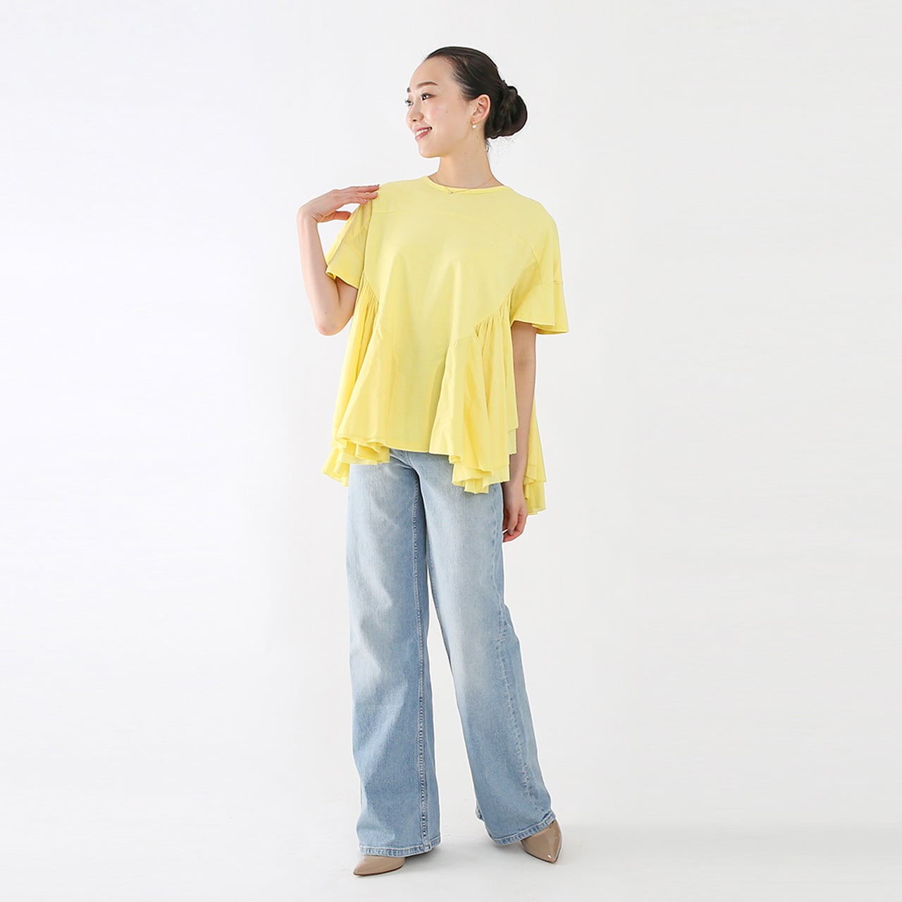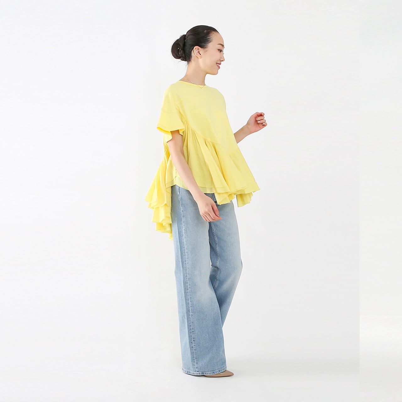 Tシャツの気軽さとブラウスの華やかさを兼ね備えた、纏うだけで心躍る、AAYUSHIならではのフリルトップスが登場。
