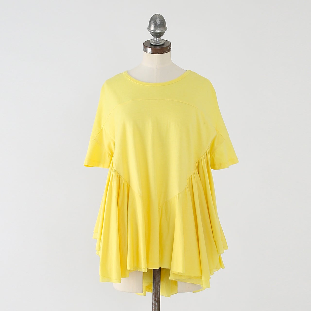 ボディ部分はカジュアルなコットンカットソー素材、フリル部分には布帛素材を使用し、軽やかなボリューム感を演出。