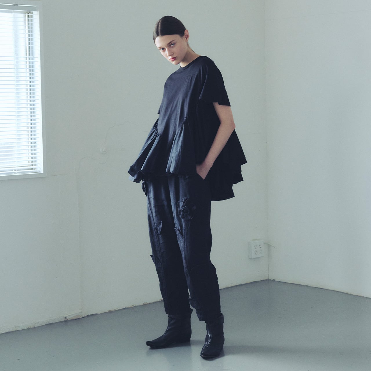独自のパターンメイクによるランダムなギャザーが、動きに合わせてボリューム感をアップさせ、着るだけで特別感のある一枚に仕上がります。