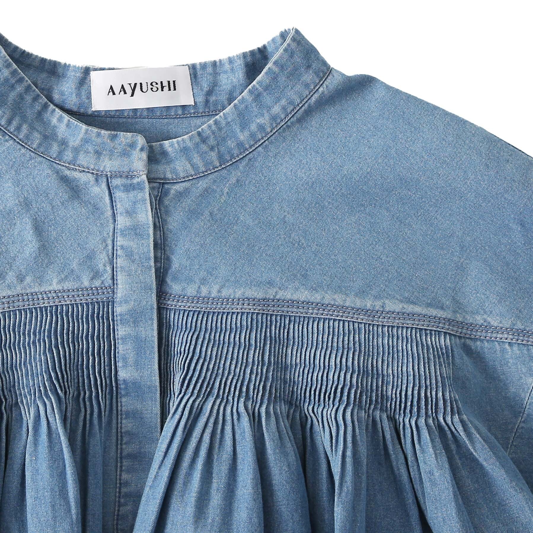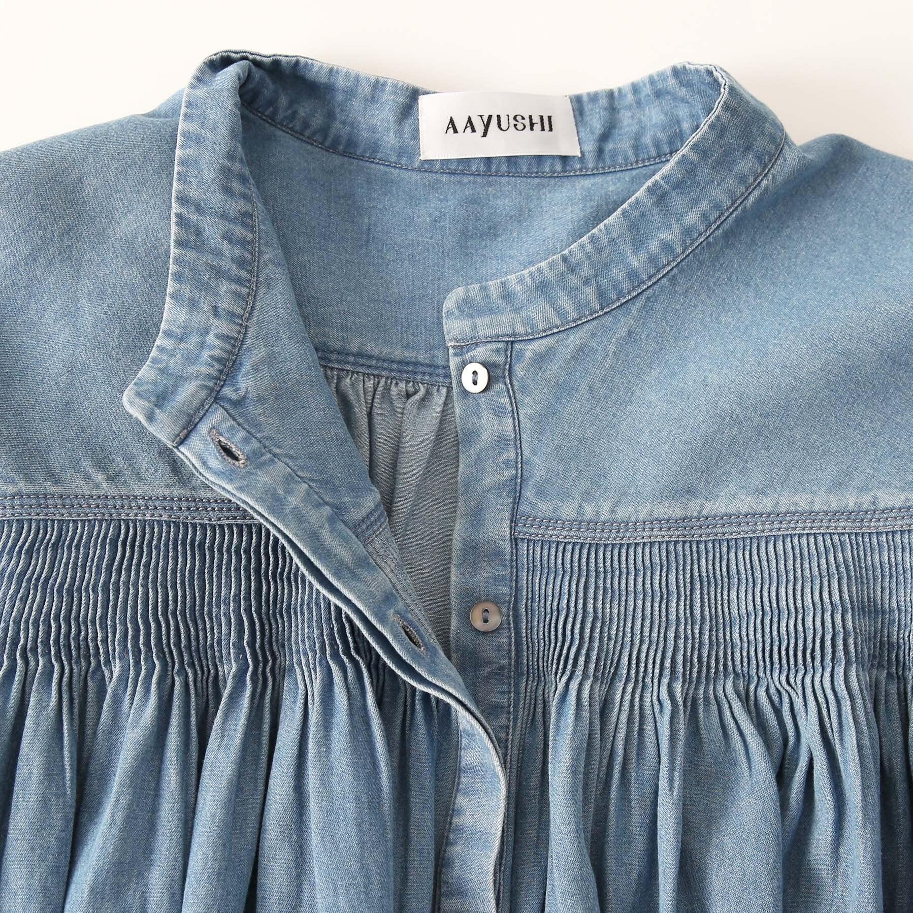 ピンタックから緩やかに流れ落ちるフレアシルエットは、身体のラインを拾いすぎず、優雅なゆとりを演出します 。デニム特有のカジュアルな素材感に、このクチュール感のあるフレアラインが融合することで、AAYUSHIならではの「日常の衣裳性」が表現されています。