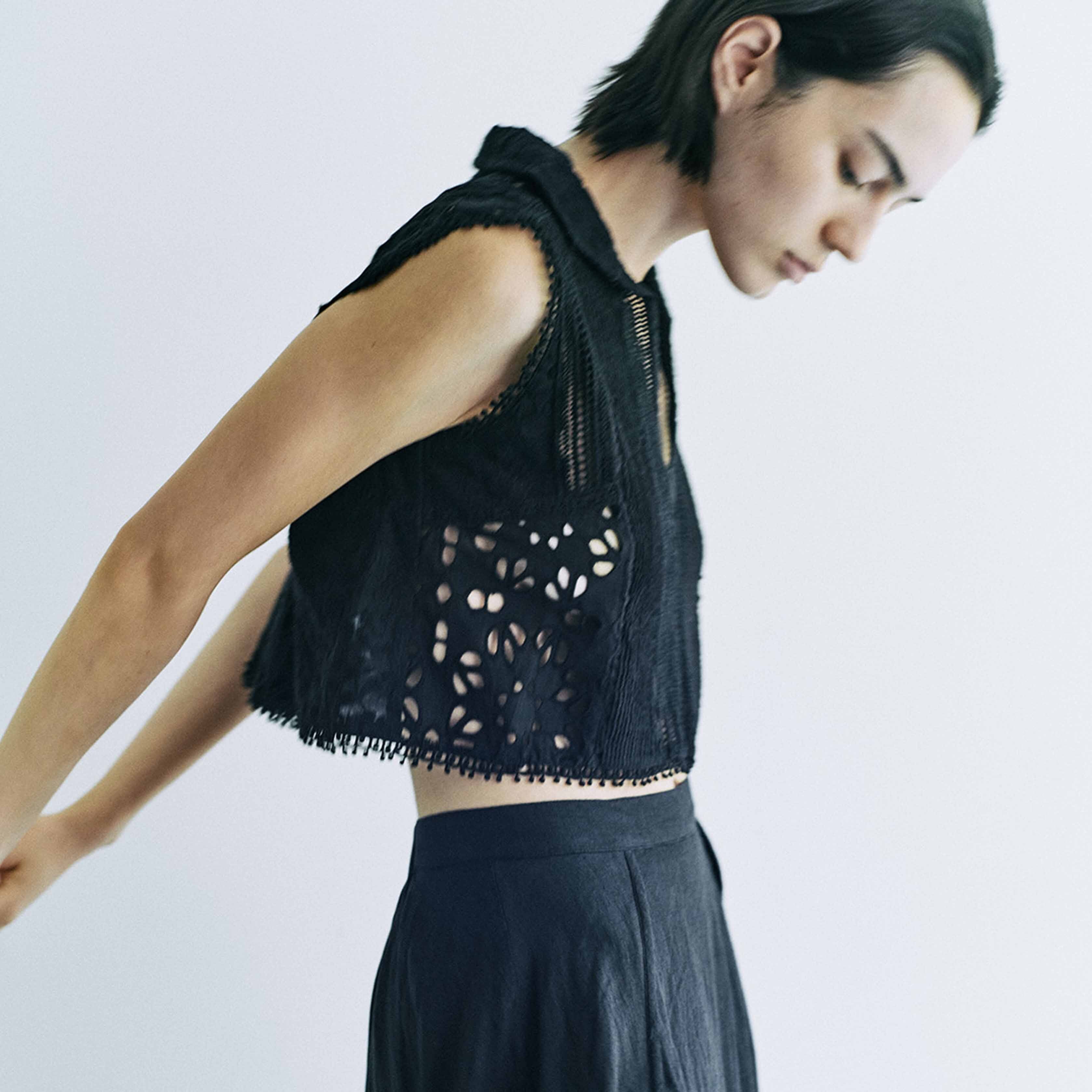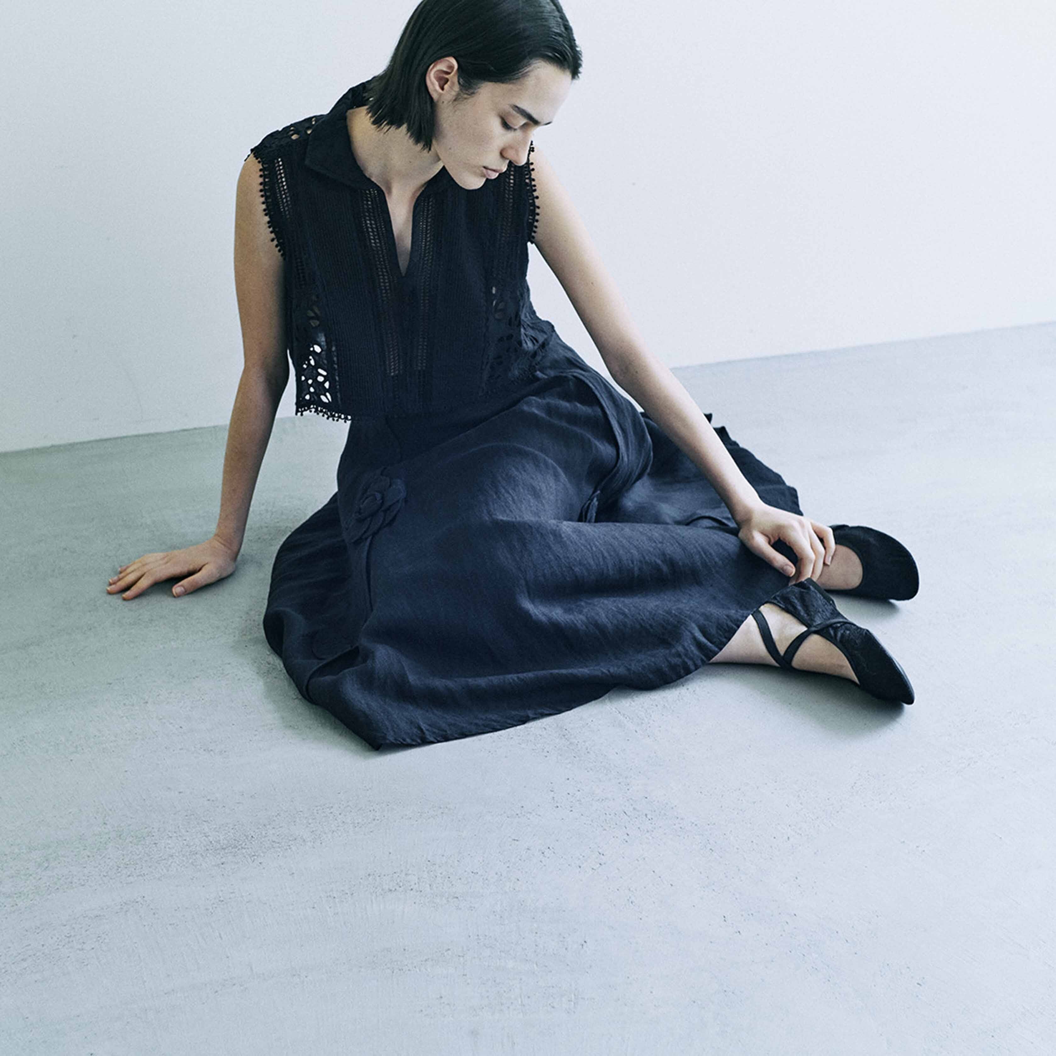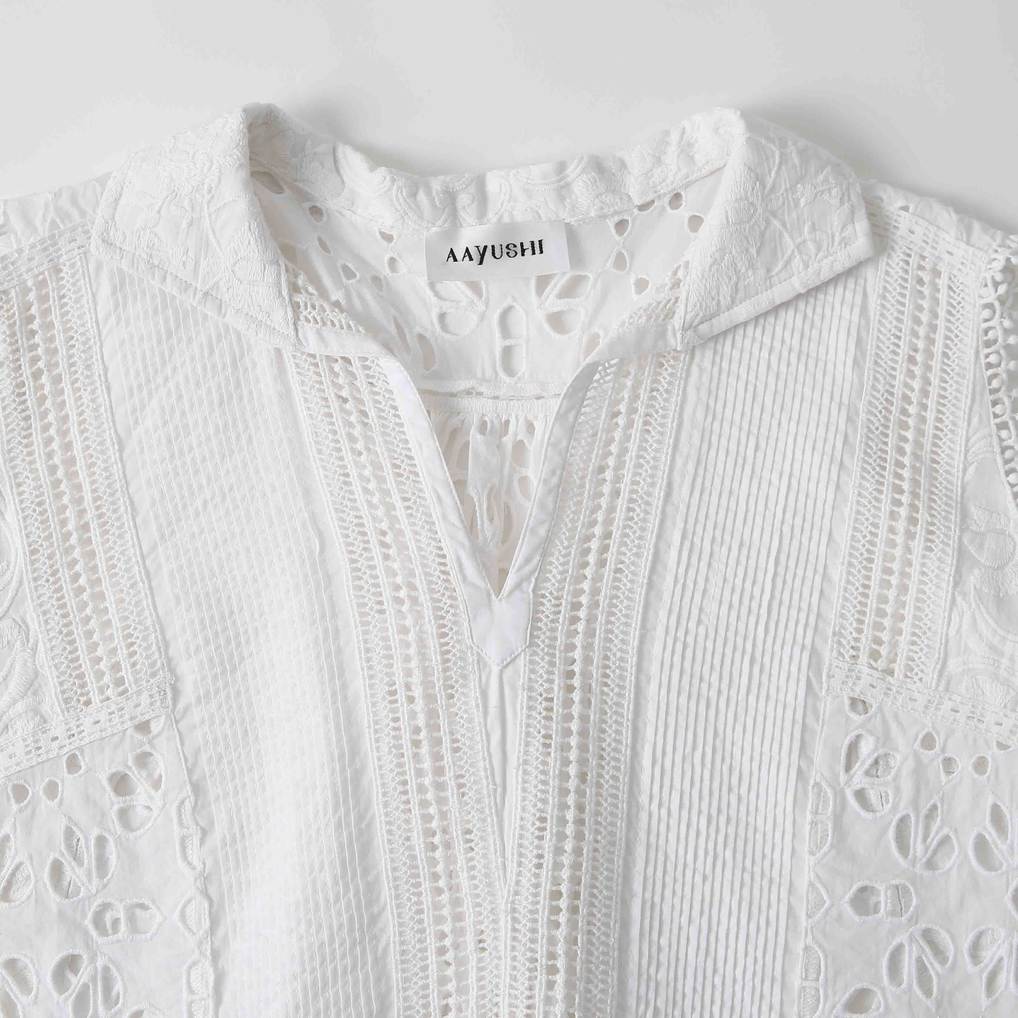 素材には、肌に吸い付くような滑らかさと軽やかさを併せ持つ80コットンボイルを使用。異なるテクスチャーのレースや刺繍をランダムに組み合わせることで、単色でありながらも奥行きのある豊かな表情を生み出しています。光を通すカットワークの隙間から覗く肌の質感は、大人の女性にふさわしい上品な色香を添えてくれます。