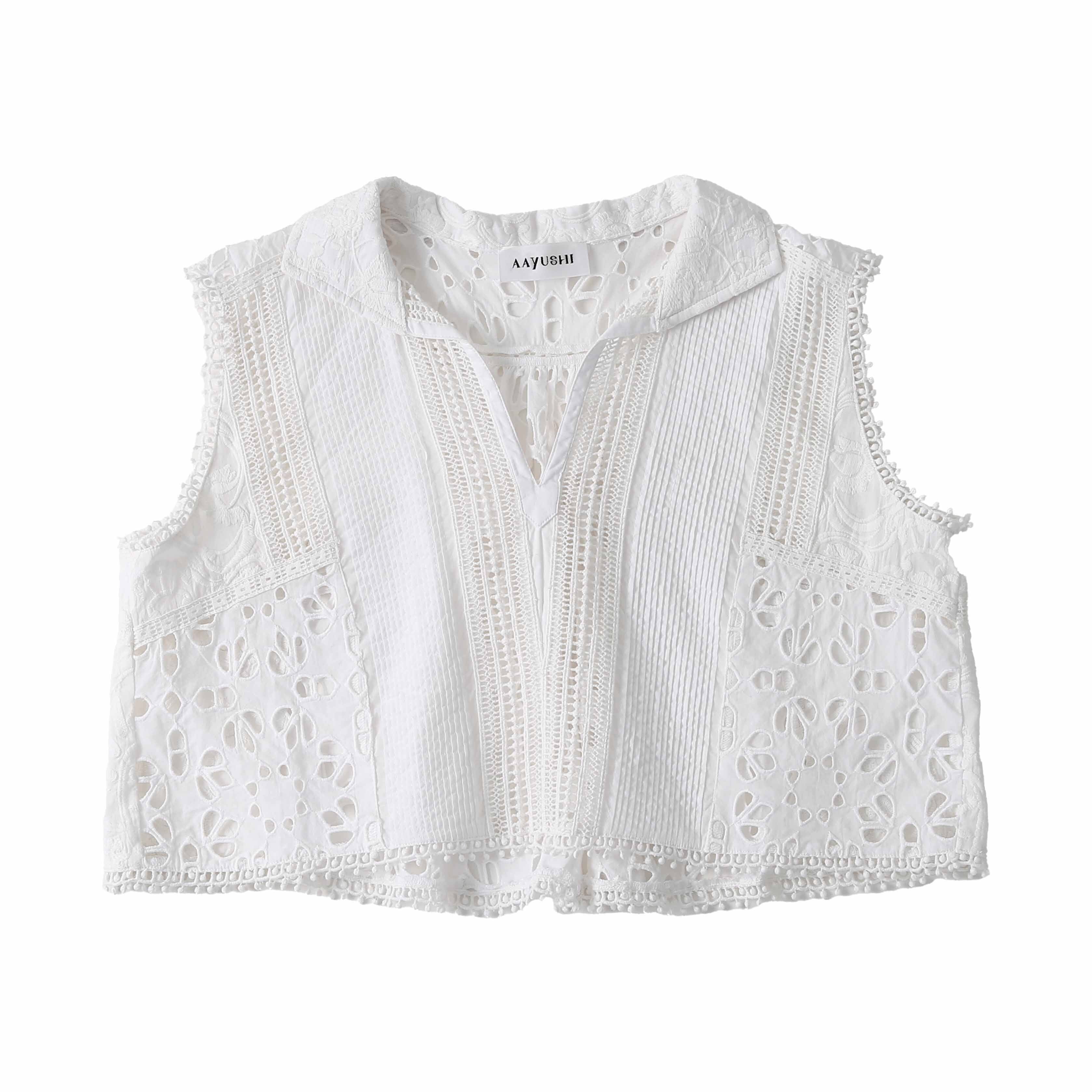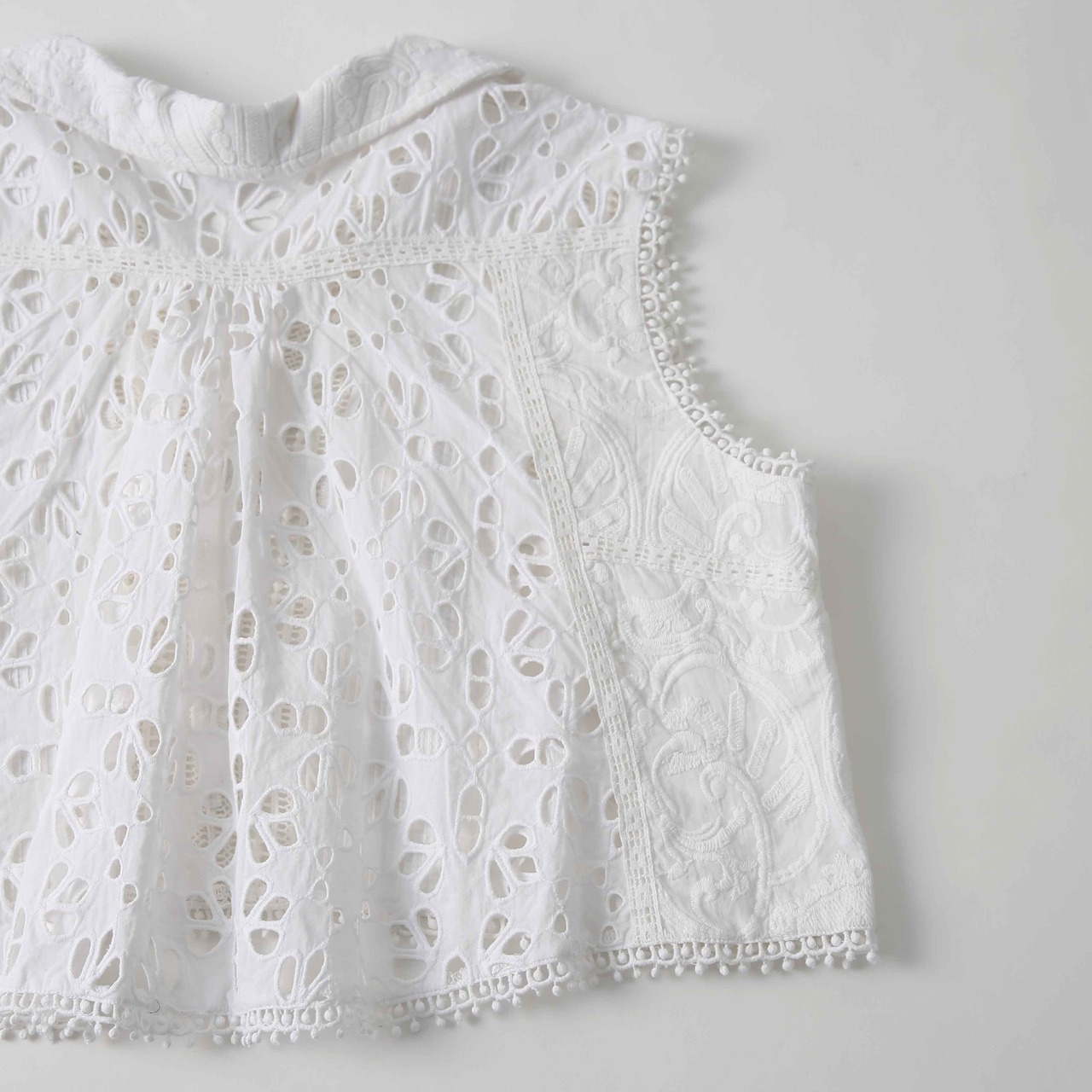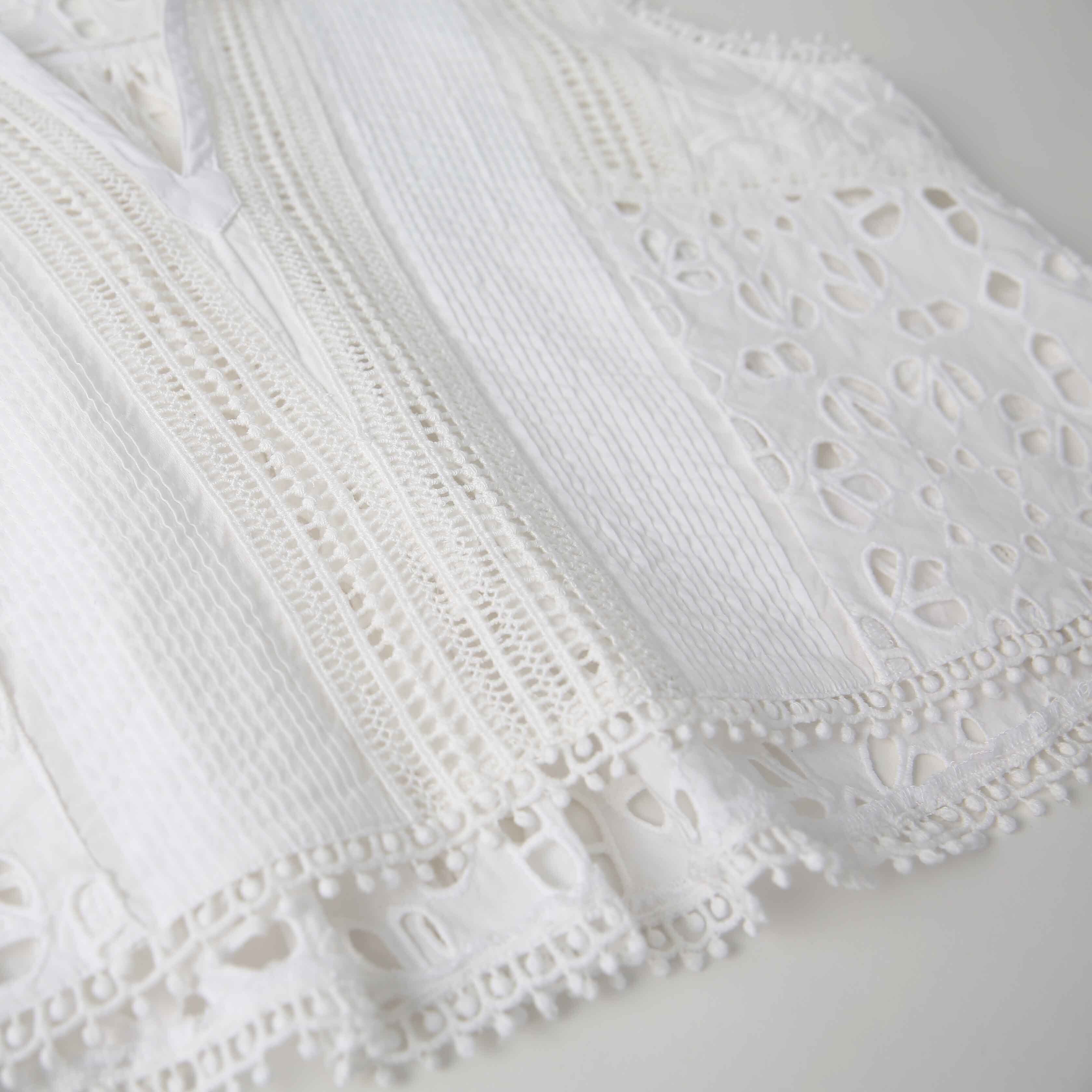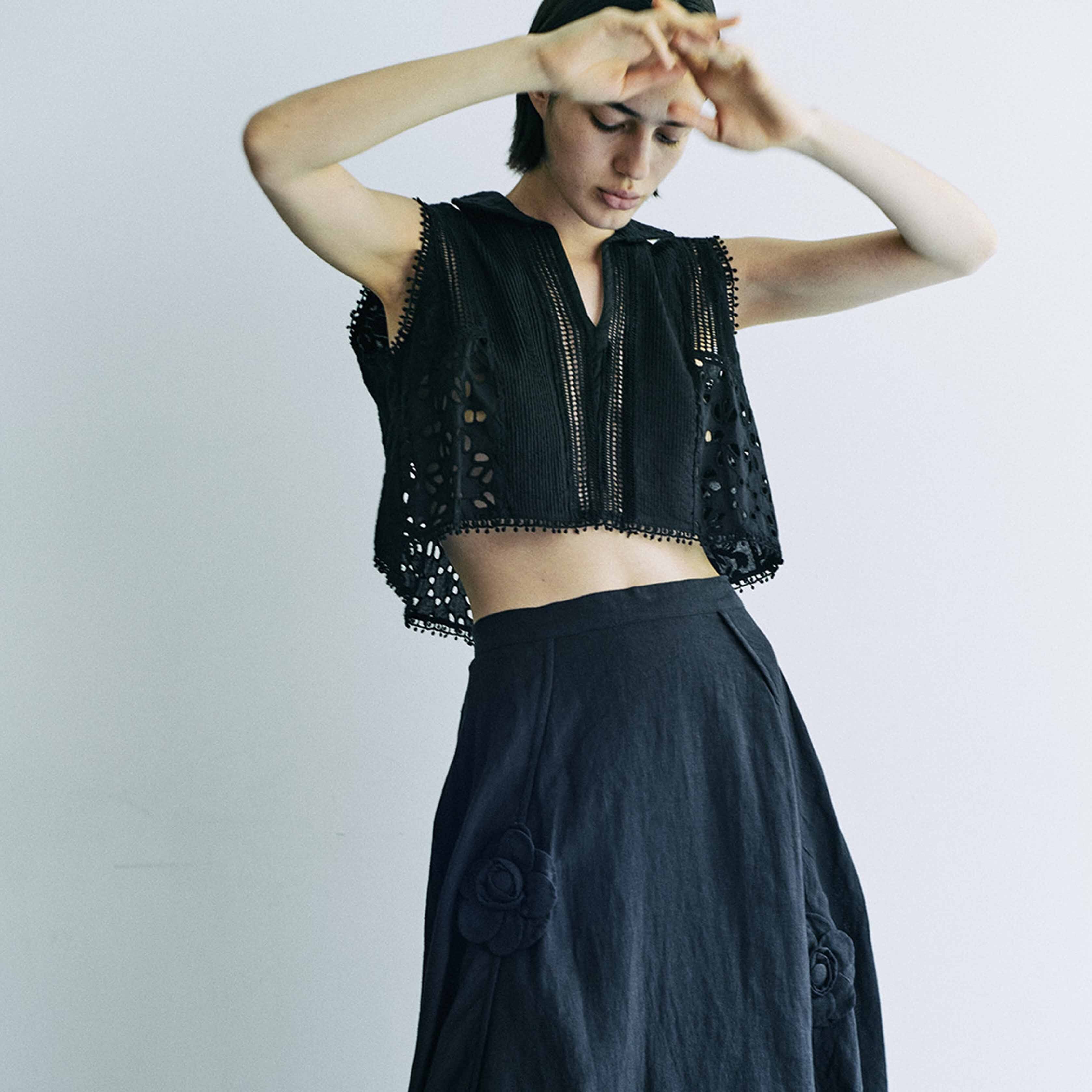 素材には、肌に吸い付くような滑らかさと軽やかさを併せ持つ80コットンボイルを使用。異なるテクスチャーのレースや刺繍をランダムに組み合わせることで、単色でありながらも奥行きのある豊かな表情を生み出しています。光を通すカットワークの隙間から覗く肌の質感は、大人の女性にふさわしい上品な色香を添えてくれます。