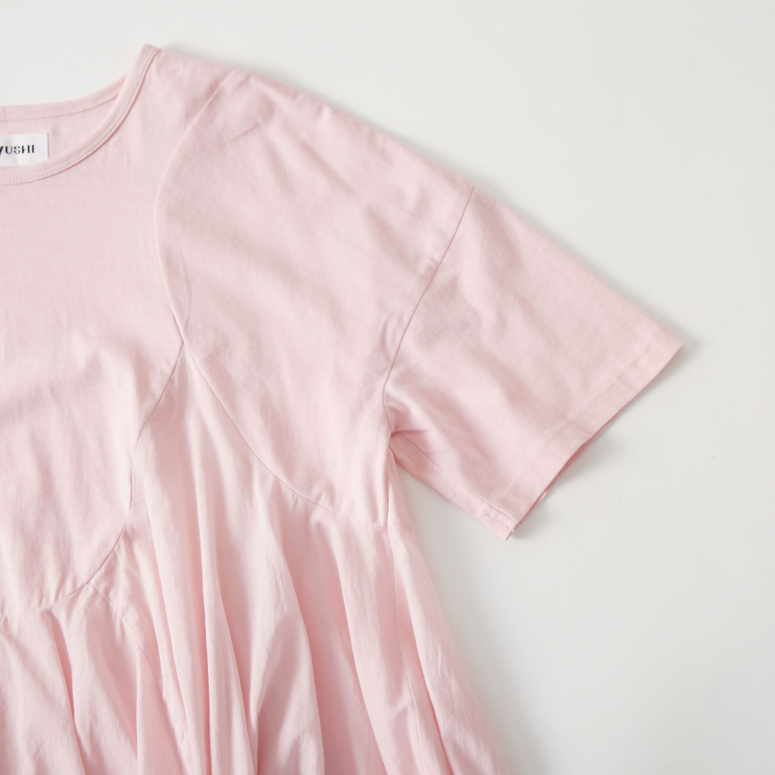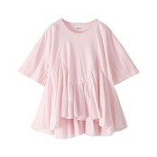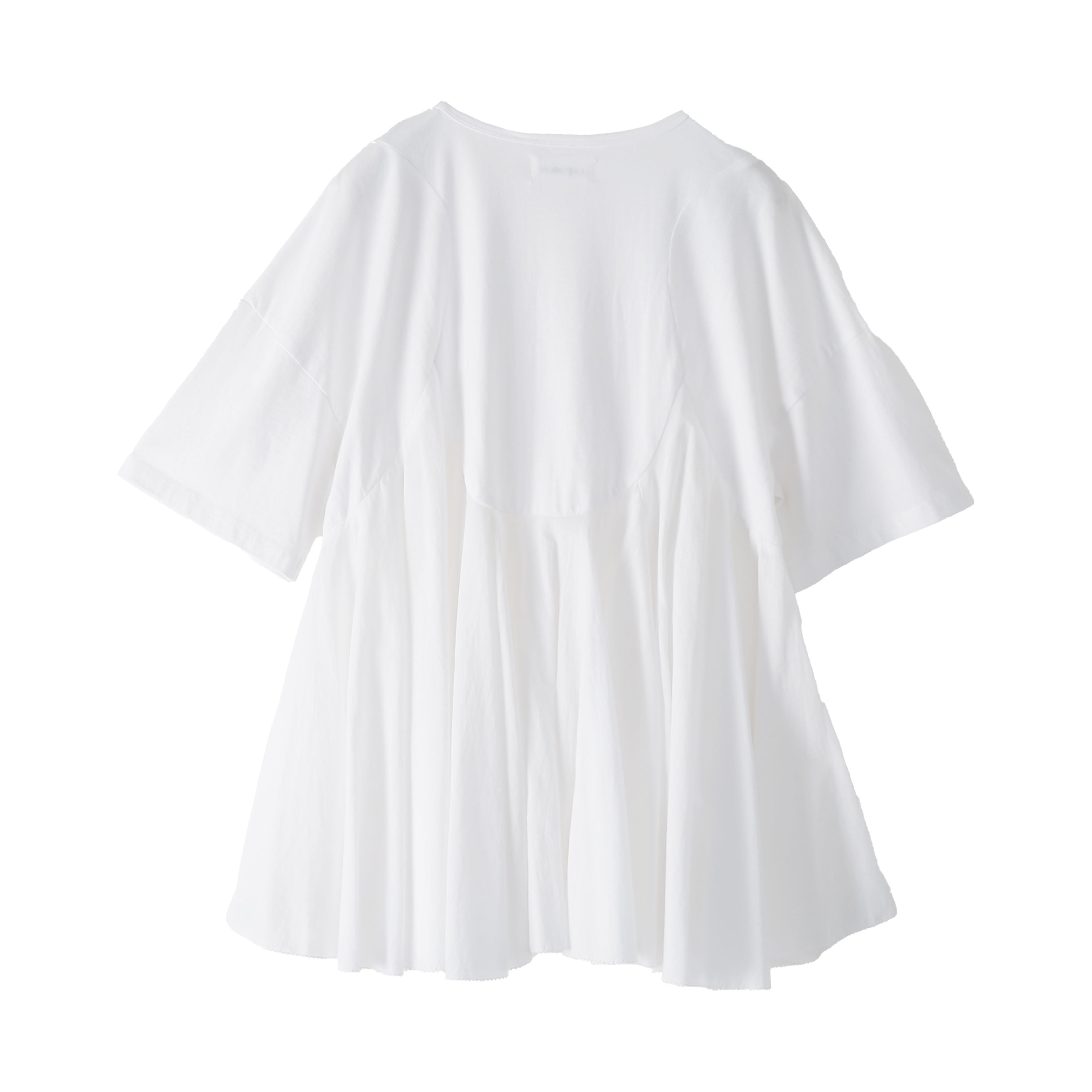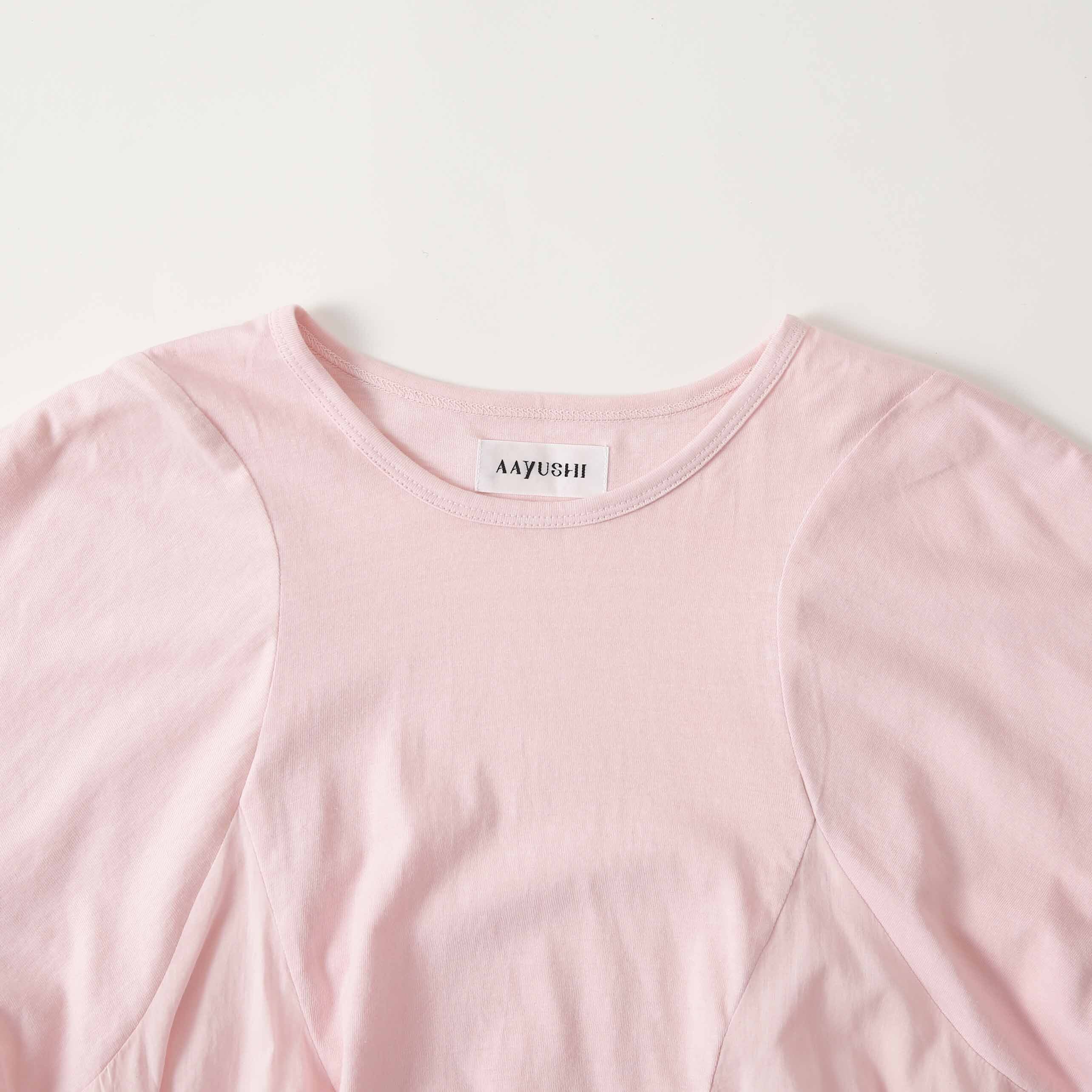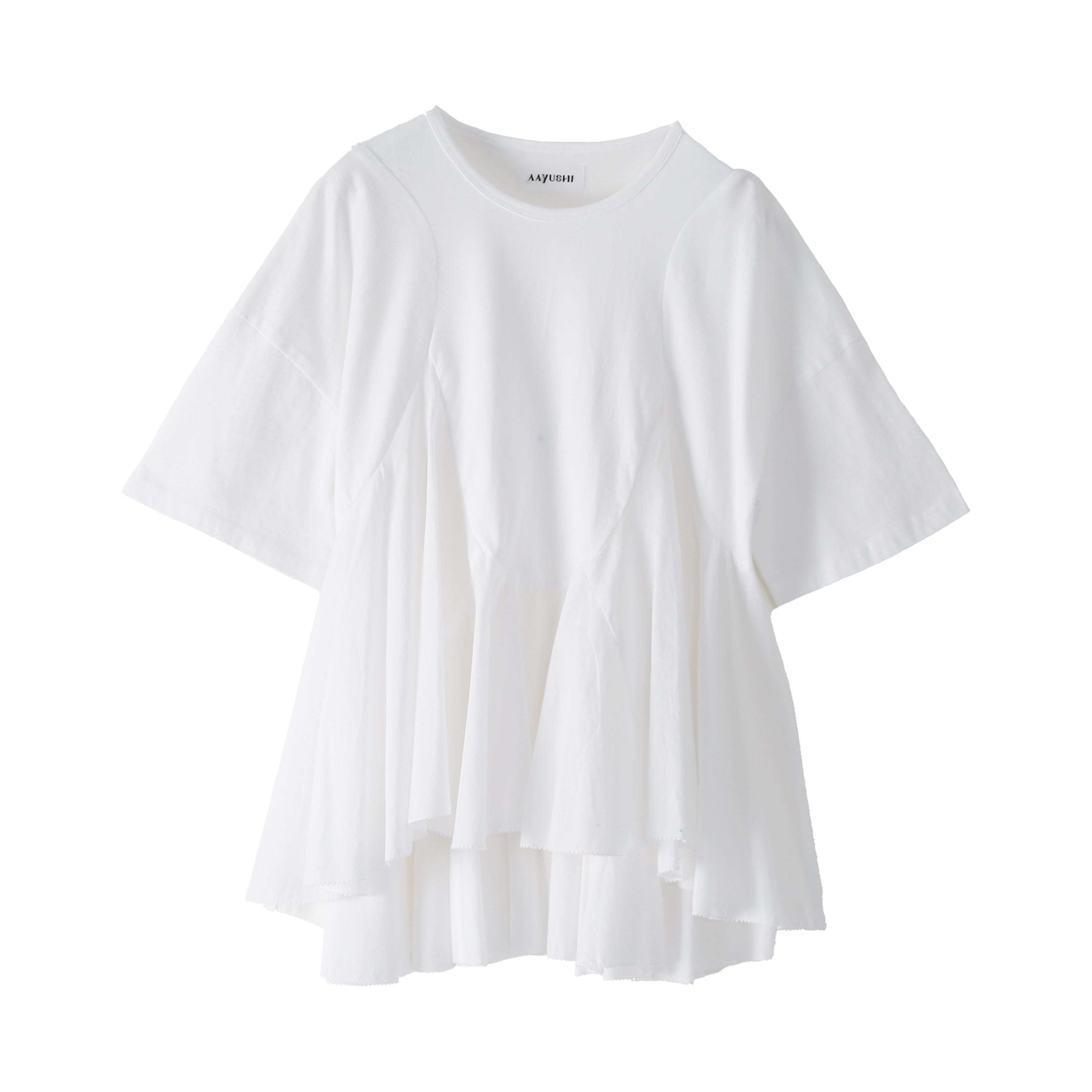 AAYUSHIが大切にしている「日常の衣裳性」を象徴する、ブランド定番のペプラムTシャツ。リラックスした着心地のカットソーに、ドラマティックな布帛のフリルを組み合わせることで、カジュアルの枠を超えたエレガントな一着に仕上げました。