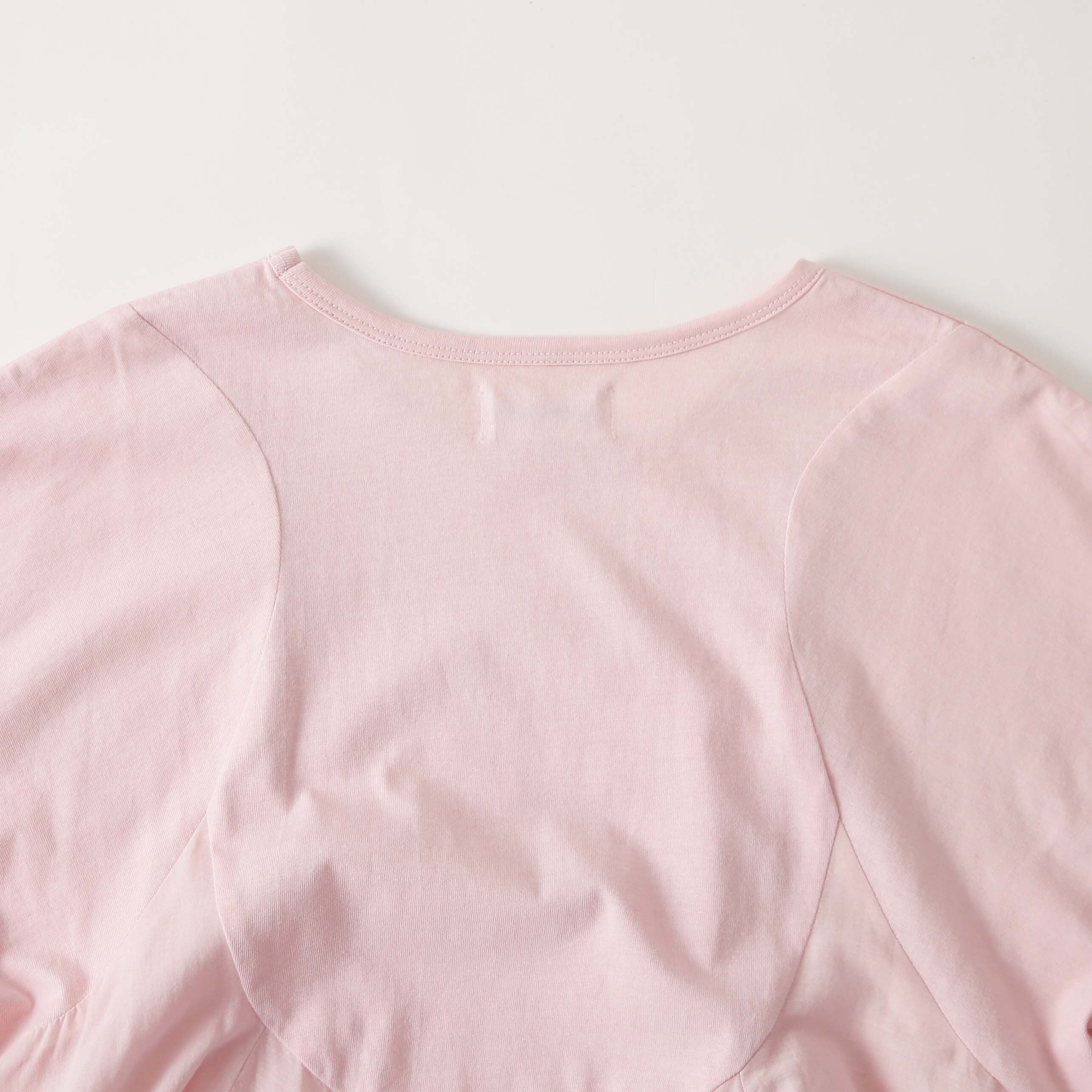 身頃には肌当たりの良い高品質なニットコットンを、そしてウエストの切り替え下には、繊細で透き通るような美しさを持つ80番手の高品質コットンボイルを贅沢に使用。異素材のコントラストが、単なるTシャツにはない奥行きと気品を演出します。