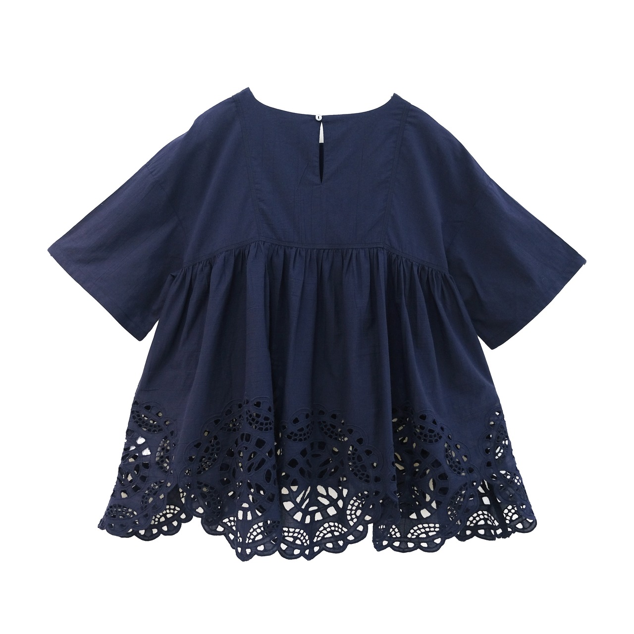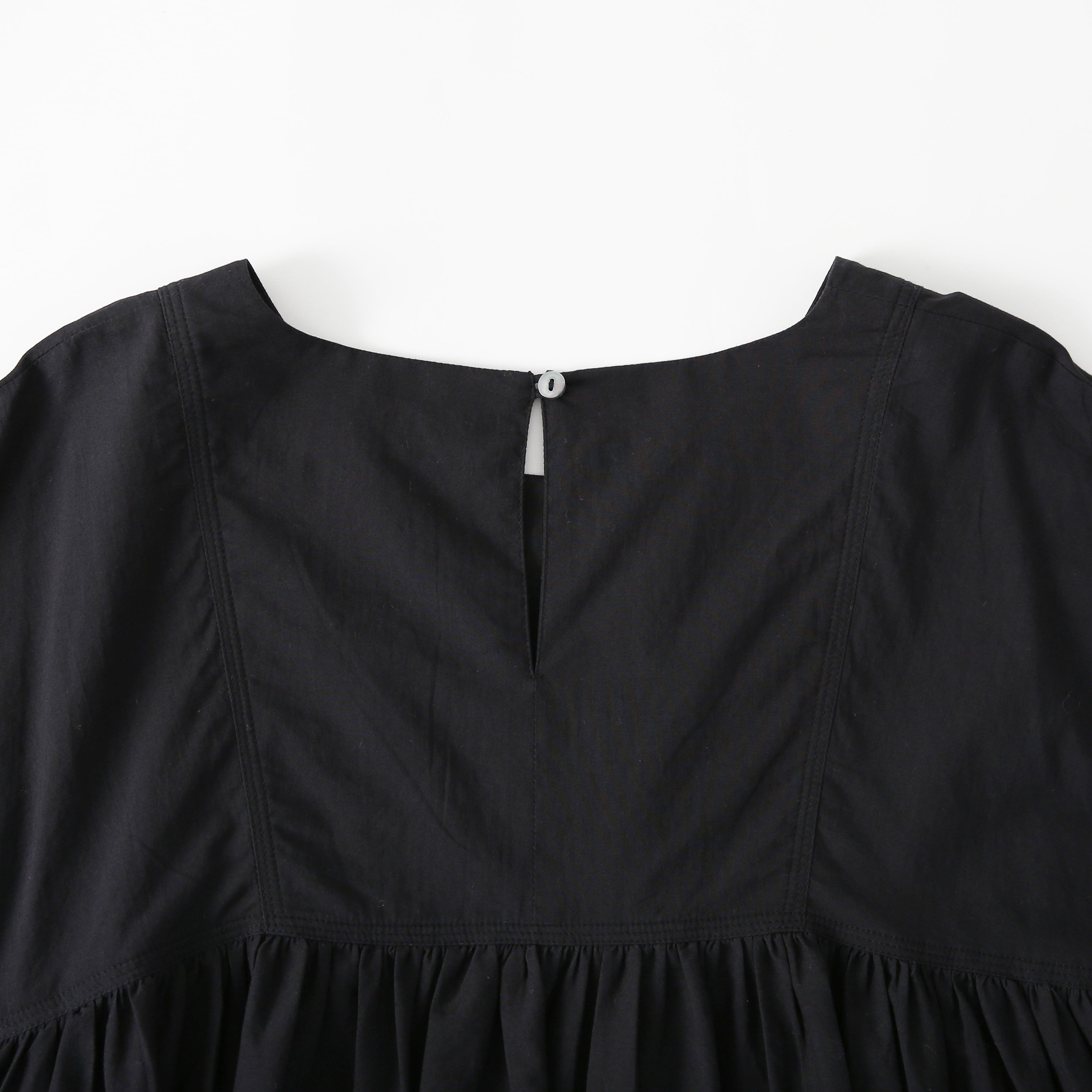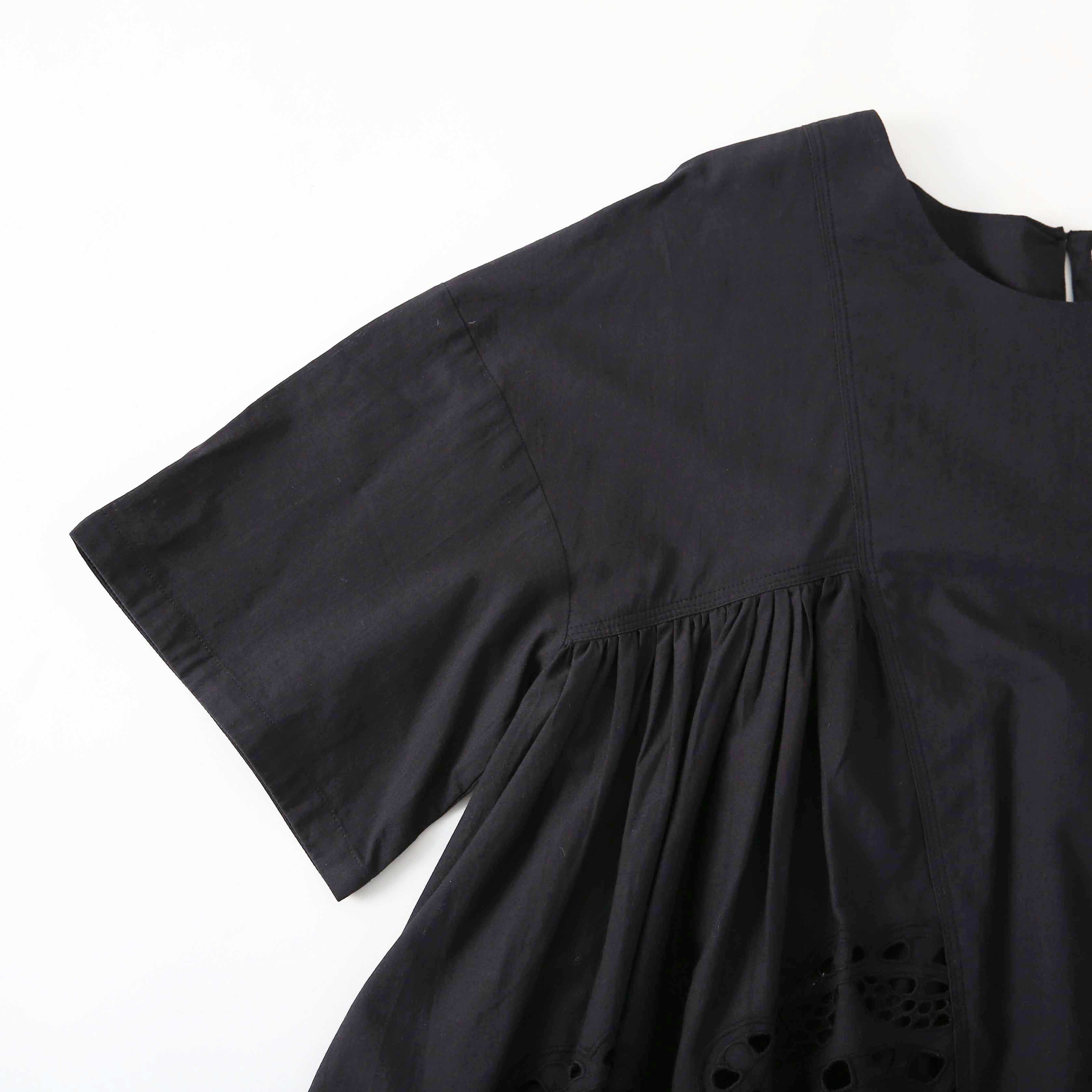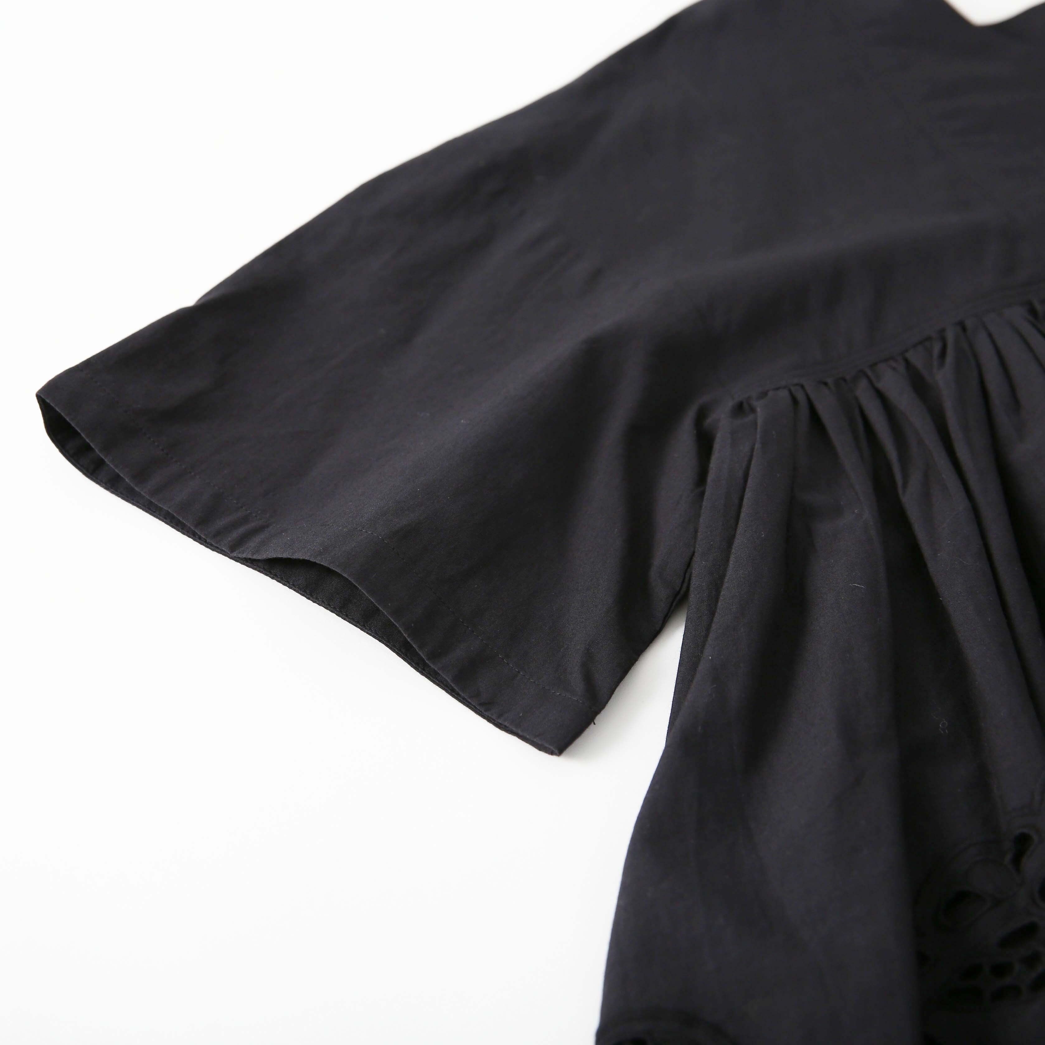 素材には、清潔感溢れるコットンポプリンを使用。程よいハリとコシがあり、肌離れの良いさらりとした質感は、春夏の陽射しの下でも凛とした佇まいをキープしてくれます。ポプリン特有のクリアな表面感が、繊細なカットワーク刺繍をより一層際立たせ、クチュールライクな気品を漂わせます。