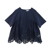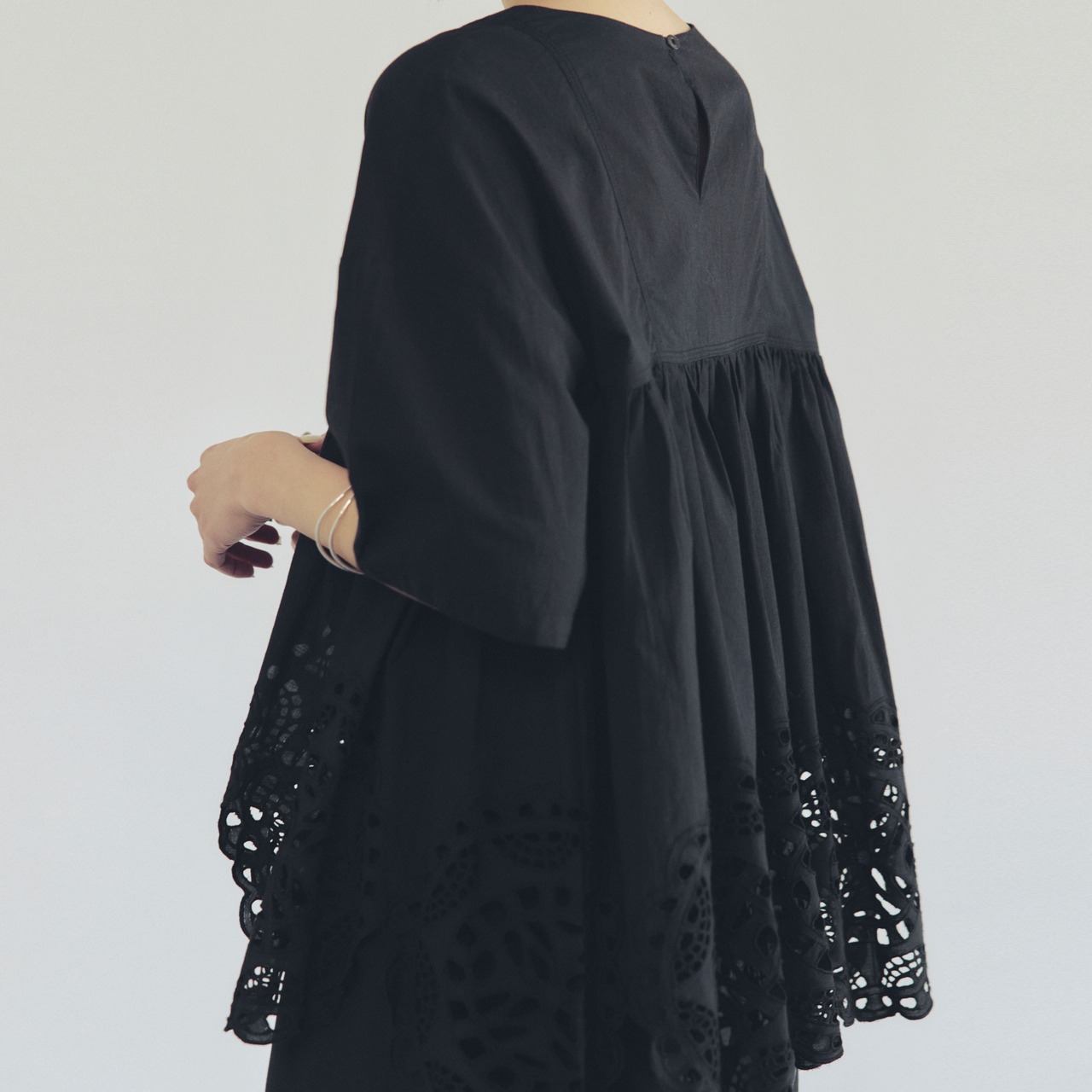 最大の魅力は、計算し尽くされた裾のカットワークデザイン。パンツやスカートなど、合わせるボトムスの色が刺繍の隙間から覗くことで、美しいコントラストが生まれます。肩幅を広めに取ったモダンなシルエットは、二の腕を自然にカバーしつつ、大人の抜け感を演出。着丈69.5cmの絶妙な丈感は、アウトスタイルで刺繍の全貌を見せる着こなしが最も映えるバランスです。
