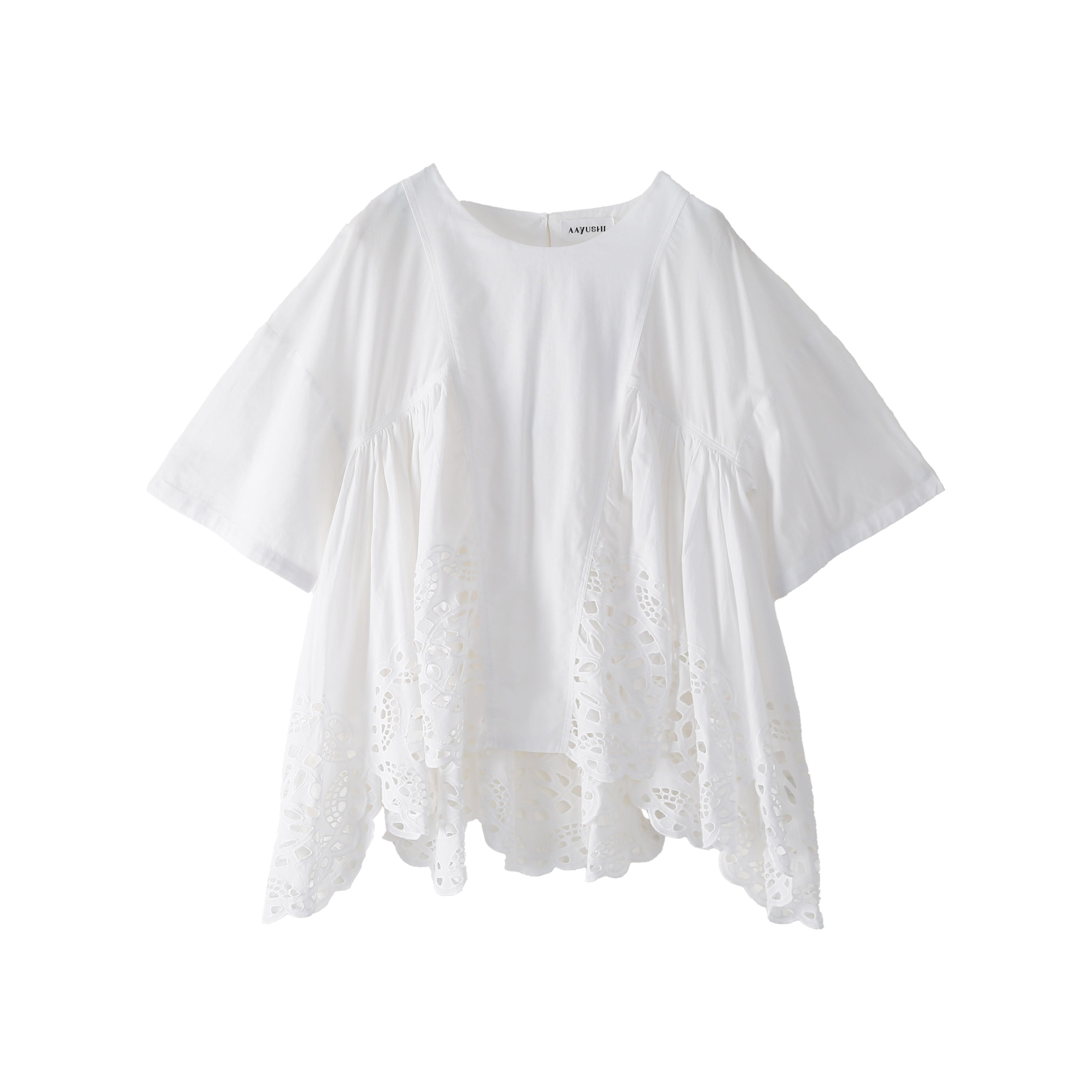イスラミックモスクの窓(ウインドウ)に施された、幾何学的な装飾美からインスピレーションを得た一着。裾まわりに贅沢にあしらわれたAAYUSHIオリジナルのカットワークが、日常の装いにドラマティックなリズムを運んでくれるブラウスです。