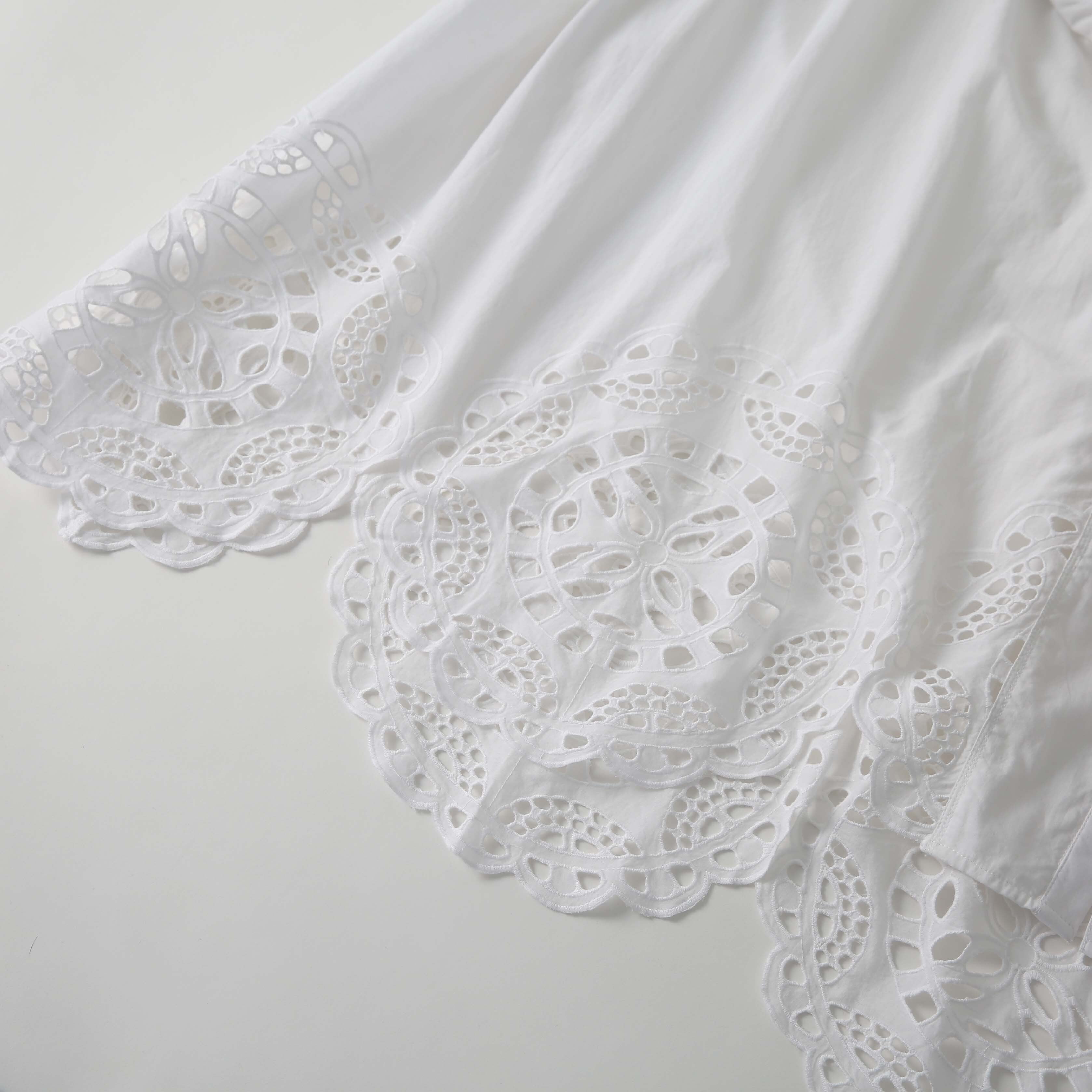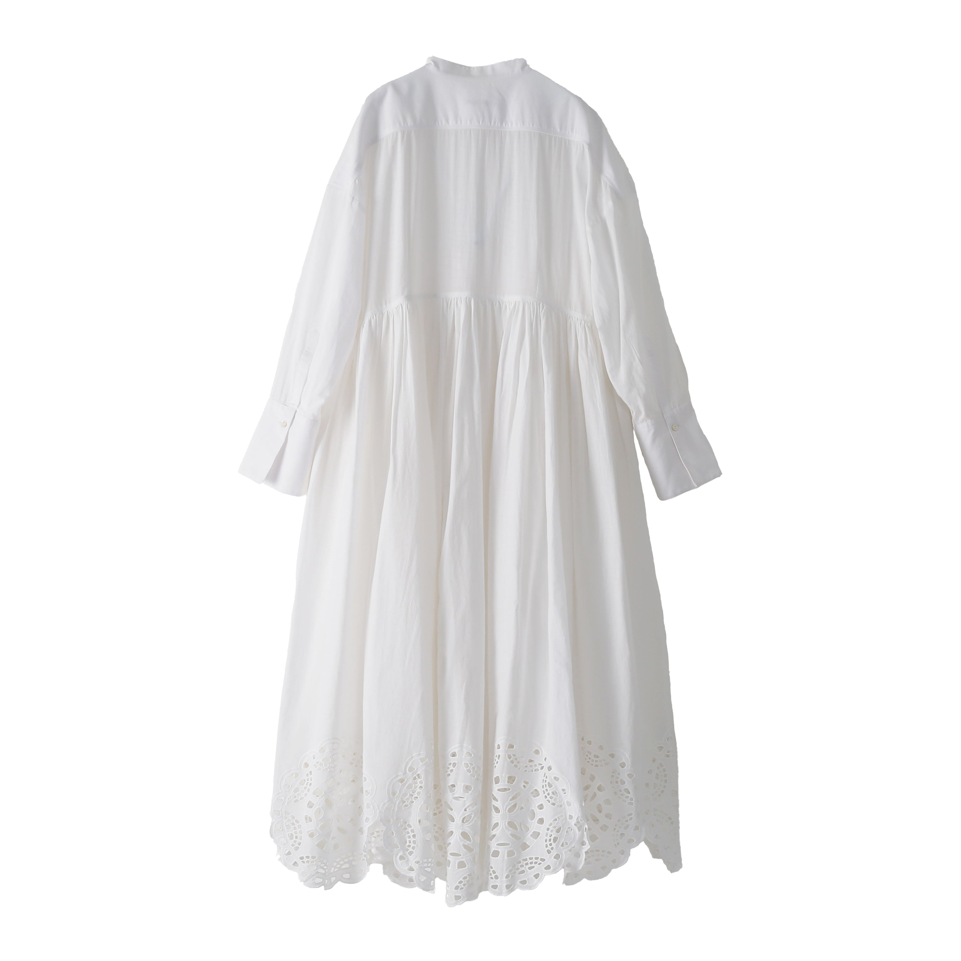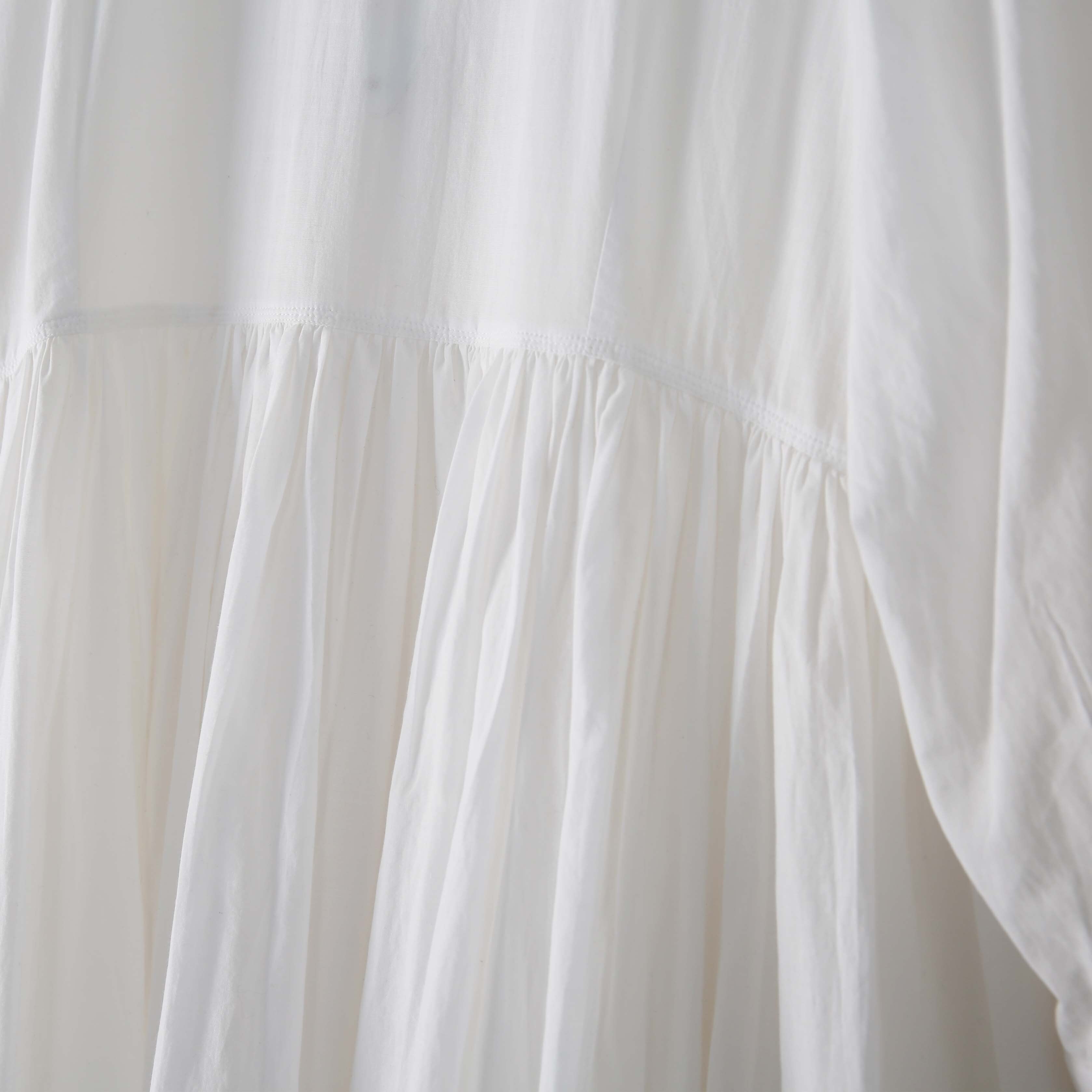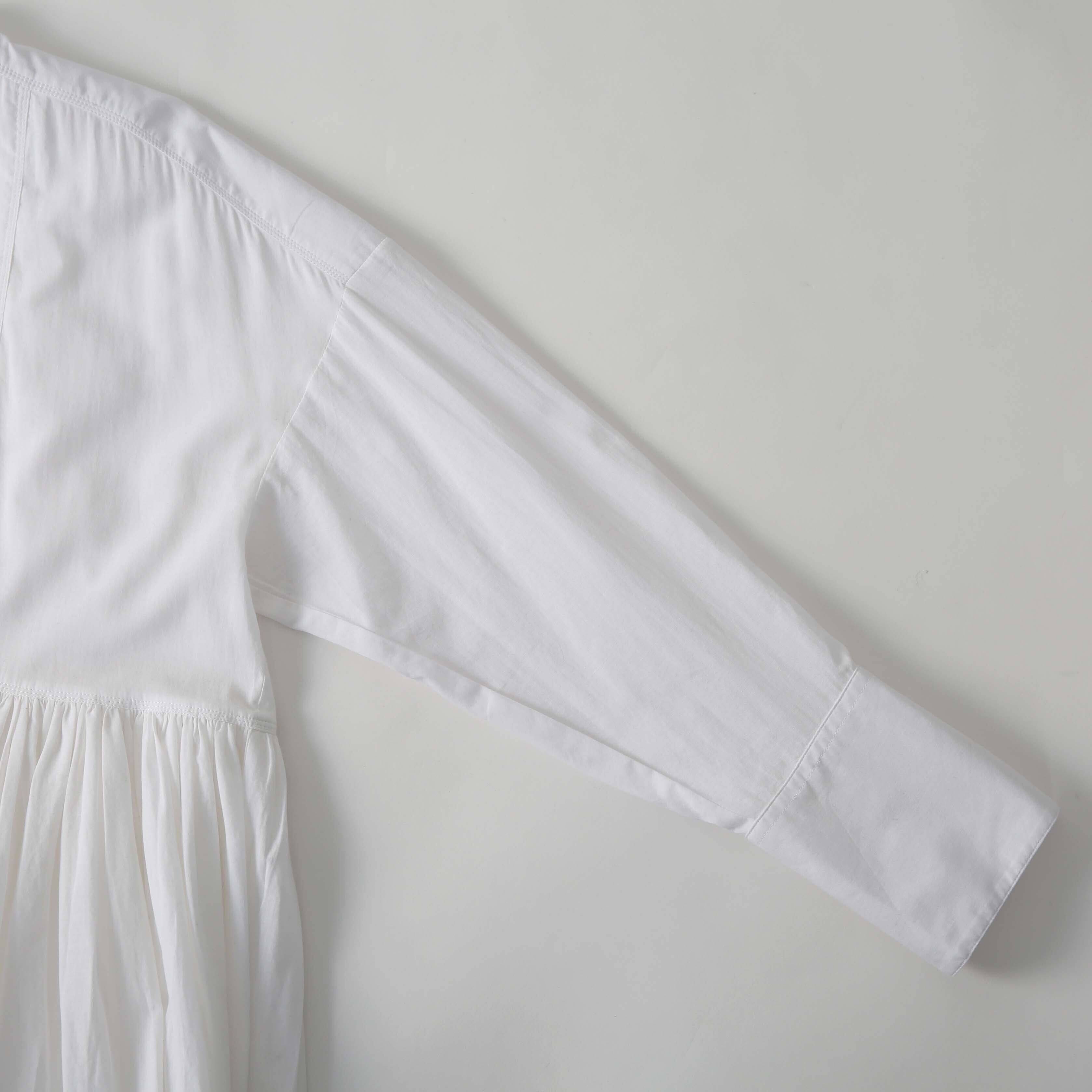 身頃には、清潔感と程よいハリのあるコットンポプリンを使用。肌離れが良く、さらりとした質感は、春夏の陽射しの下でも凛とした佇まいをキープしてくれます。裏地には柔らかなコットンボイルを施し、軽やかさはそのままに、一枚でドレスとして纏える安心感と極上の肌当たりを両立させました。