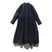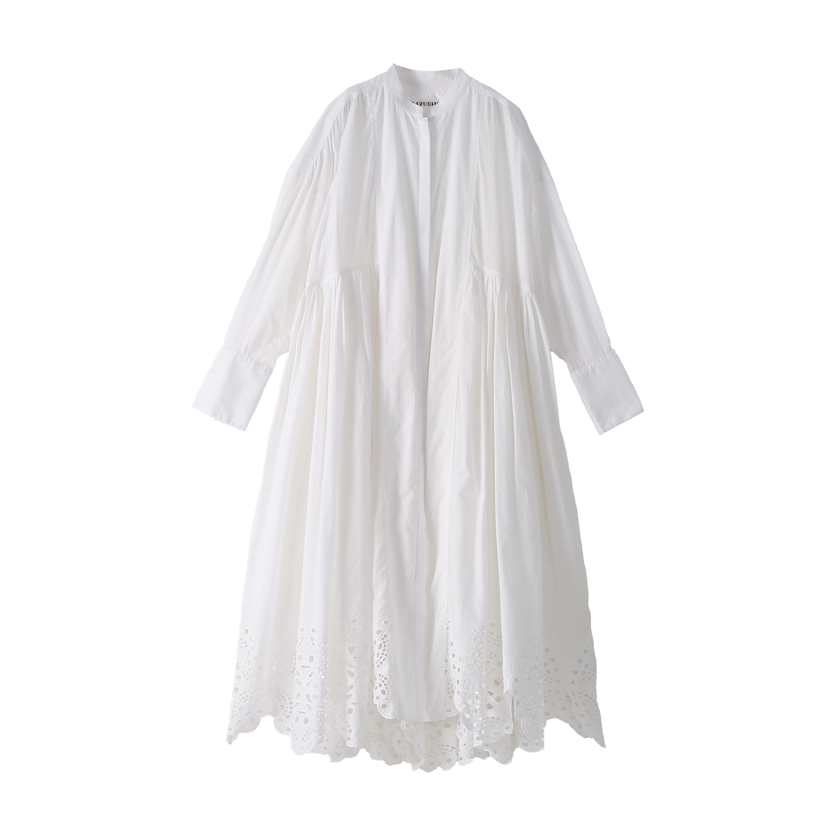 イスラミックモスクの窓(ウインドウ)に施された、幾何学的な装飾美からインスピレーションを得た一着。緻密なオリジナルカットワークが裾や袖口に贅沢にあしらわれ、歩くたびに刺繍の隙間から光がこぼれる様子は、まるで動く芸術品のようです。