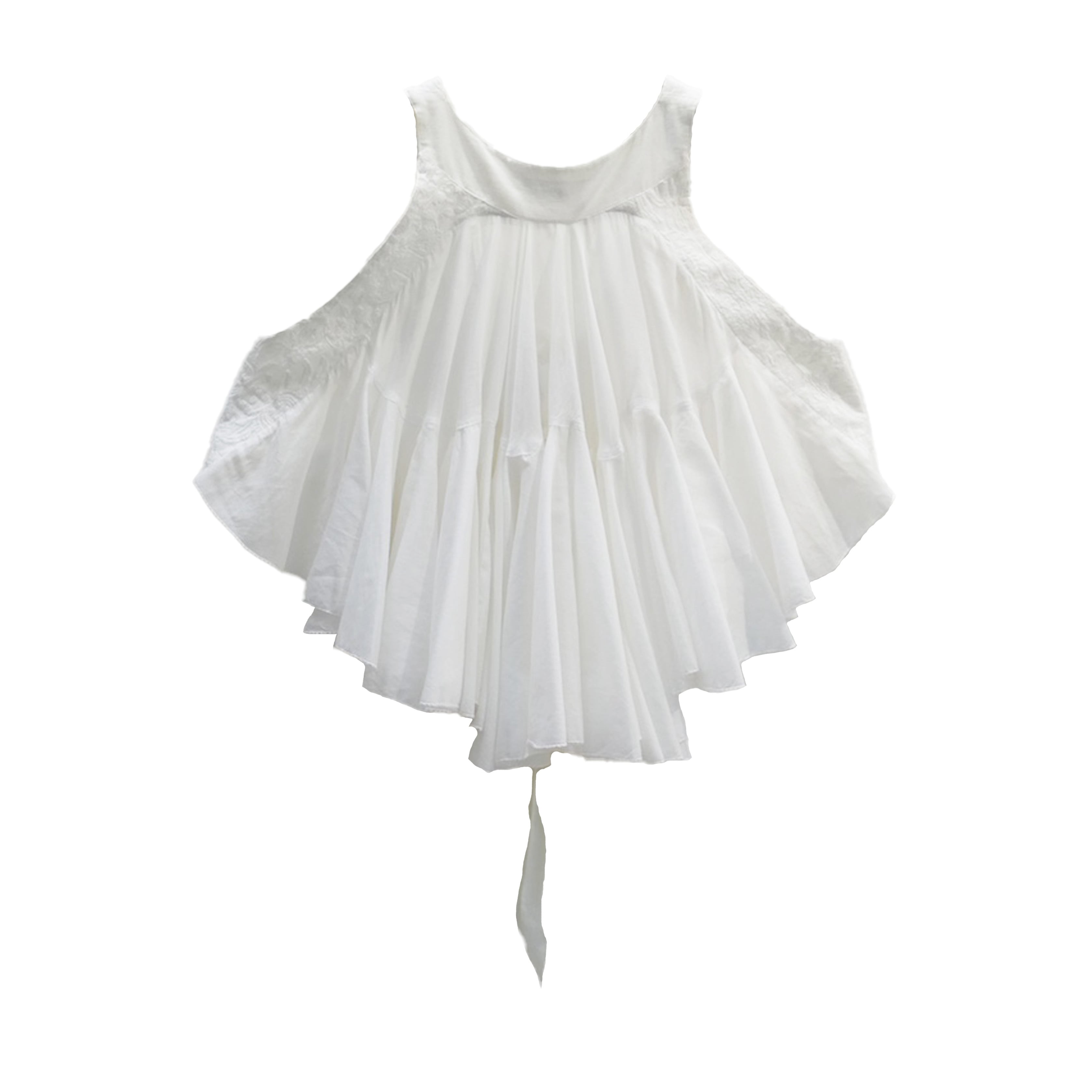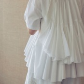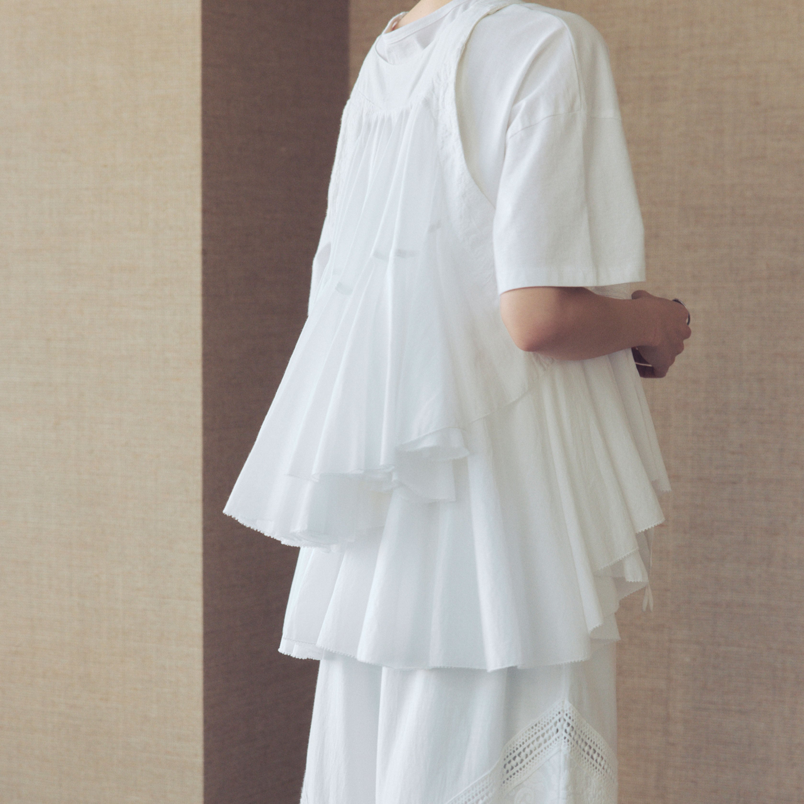 ベース素材には、ナチュラルな風合いの中に程よいハリ感を残したコットンフレックスを使用。フロントはスッキリとした端正な表情ながら、バックスタイルには計算されたランダムギャザーによる軽やかなフレアラインを贅沢に施しました。歩くたびに背中で揺れるフリルの重なりが、見る人を惹きつけるドラマティックな余韻を残します。