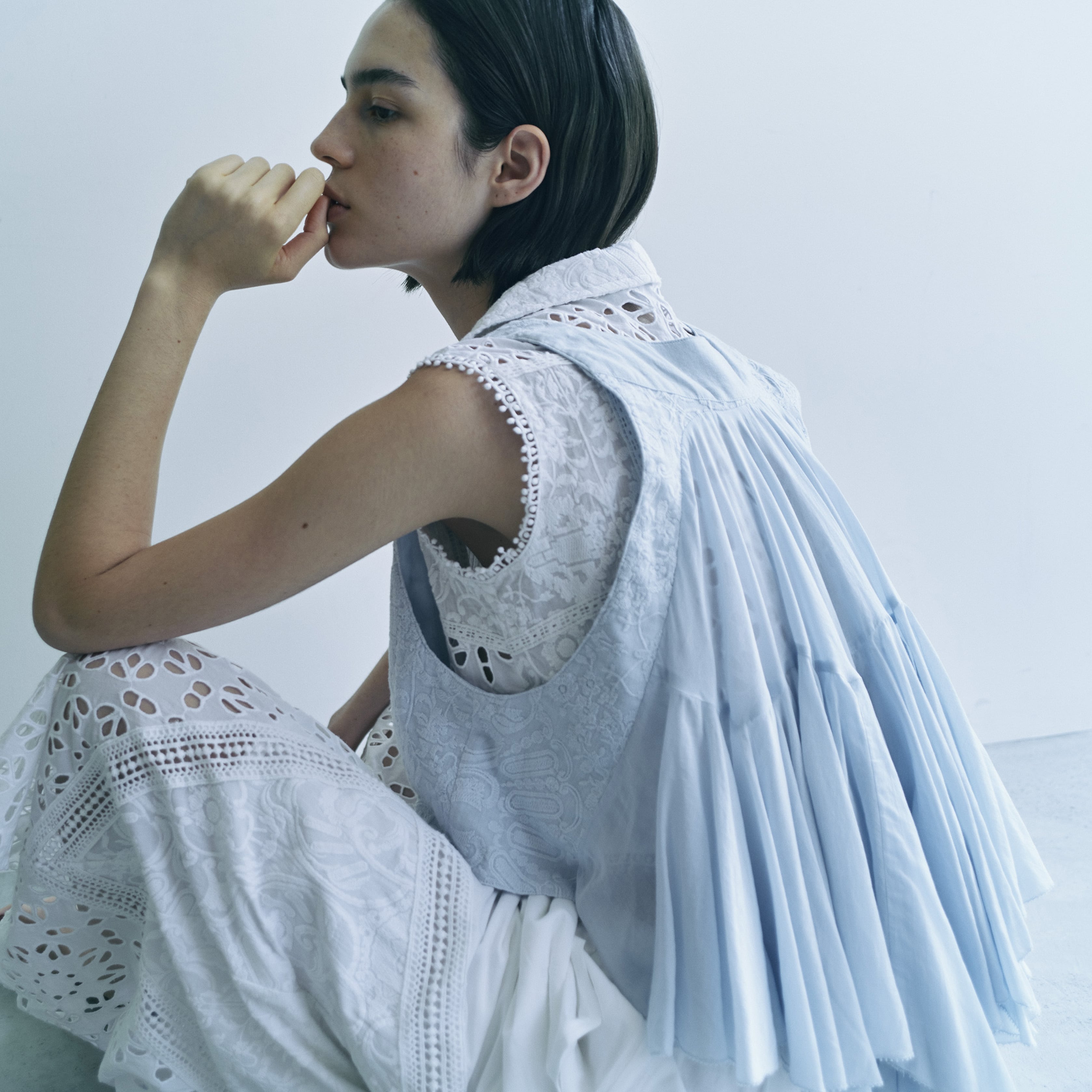 カラーは、クリーンなWhite、芯の強さを感じさせるBlack、そして透明感あふれる爽やかなLightBlueの3色展開。「いつものスタイル」を瞬時に「特別な装い」へと変えてくれる、ワードローブに新しい風を吹き込むアーティスティックな逸品です。