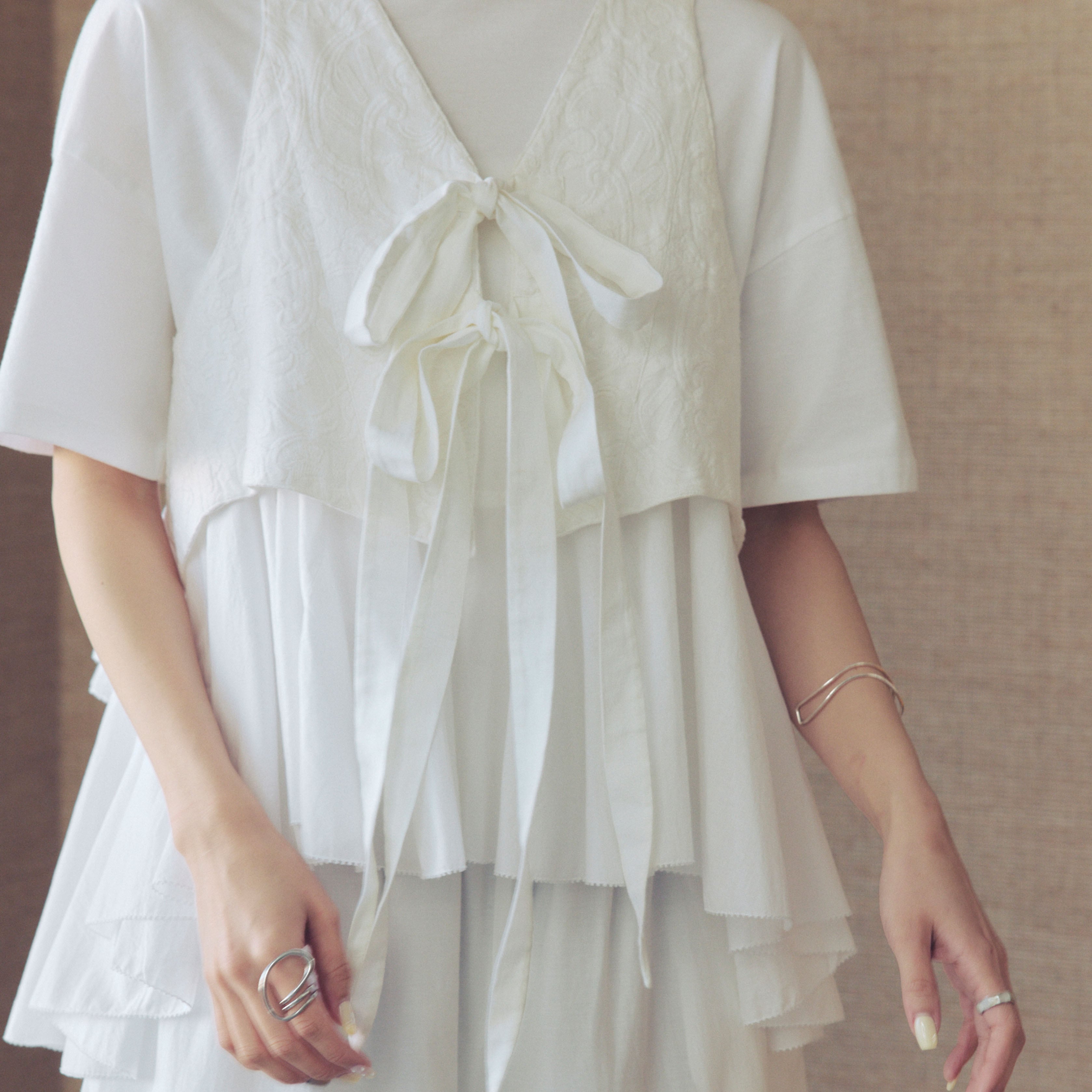 イスラミック建築の荘厳なモスクからインスパイアされた、独創的なテクスチャーが目を惹くジレ(ベスト)。日常の装いにプラスするだけで、一気にモードで華やかな印象へと引き上げてくれる、AAYUSHIの美学が詰まった一着です。