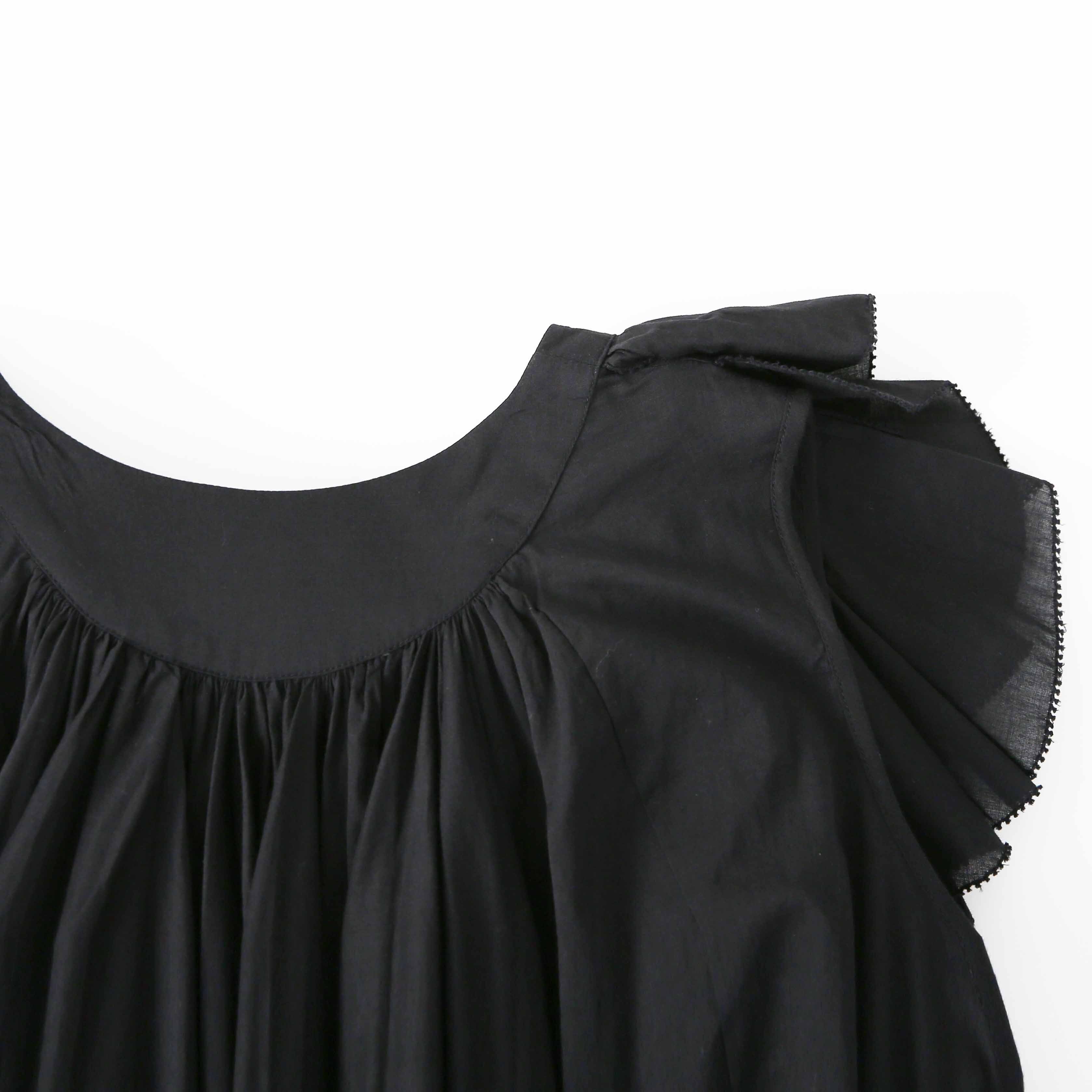 素材には、インドの熟練した技術による100番手の高品質コットンボイルを贅沢に使用。極細糸で織り上げられた生地は、驚くほど軽やかで透き通るような透明感があり、ボリュームのあるラッフルも重たさを感じさせず、ふんわりと空気を纏うような着心地を実現。