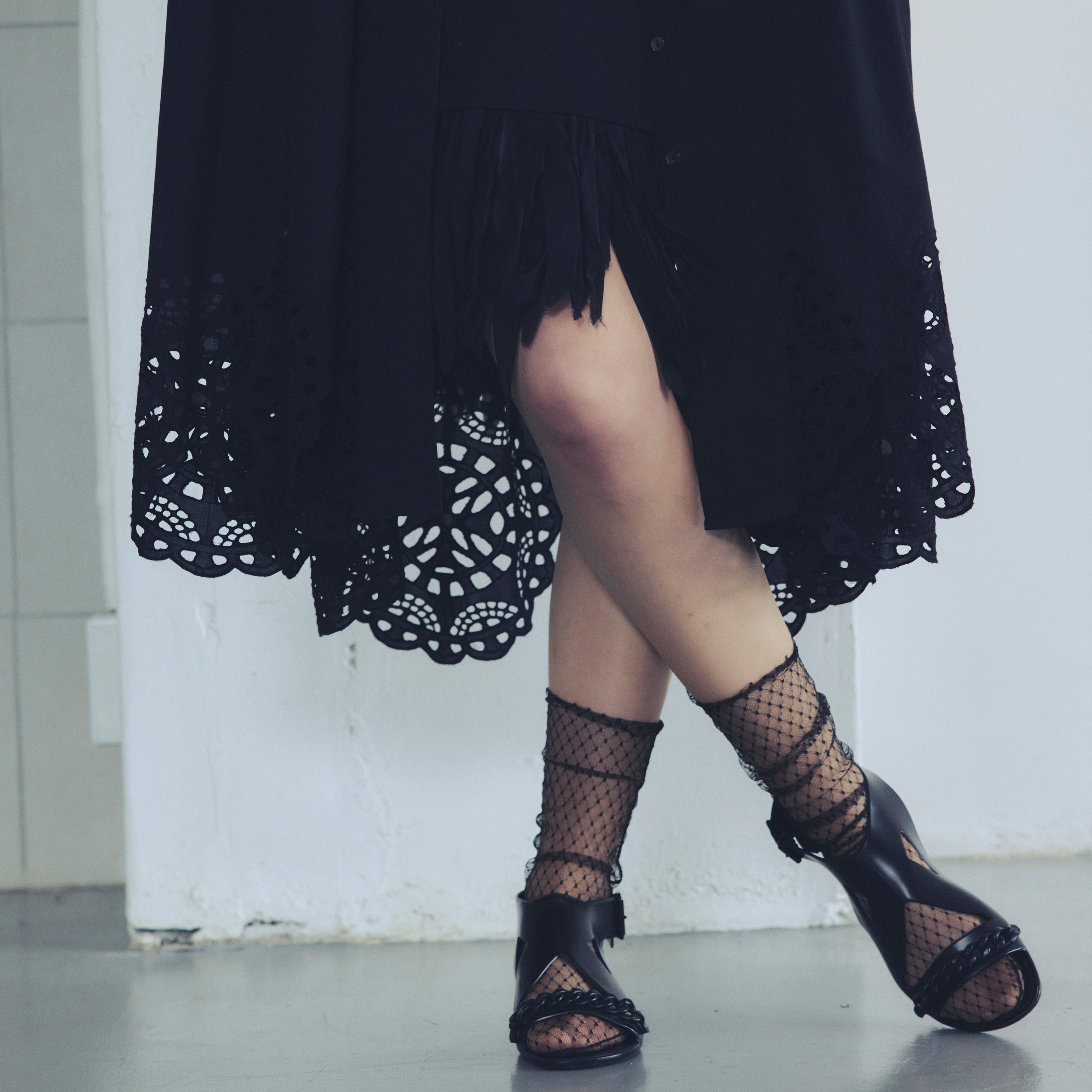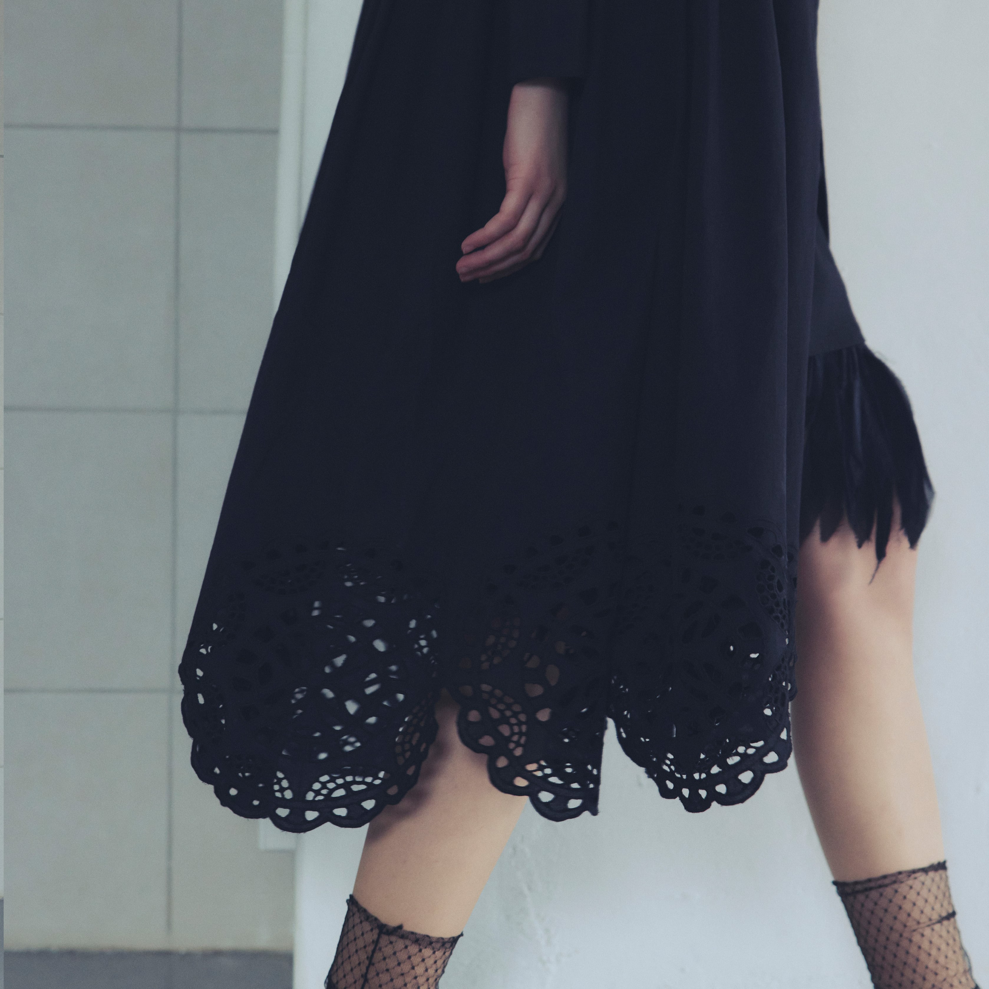 イスラミックモスクの窓(ウインドウ)に施された、幾何学的な装飾美からインスピレーションを得た一着。緻密なオリジナルカットワークが裾や袖口に贅沢にあしらわれ、歩くたびに刺繍の隙間から光がこぼれる様子は、まるで動く芸術品のようです。