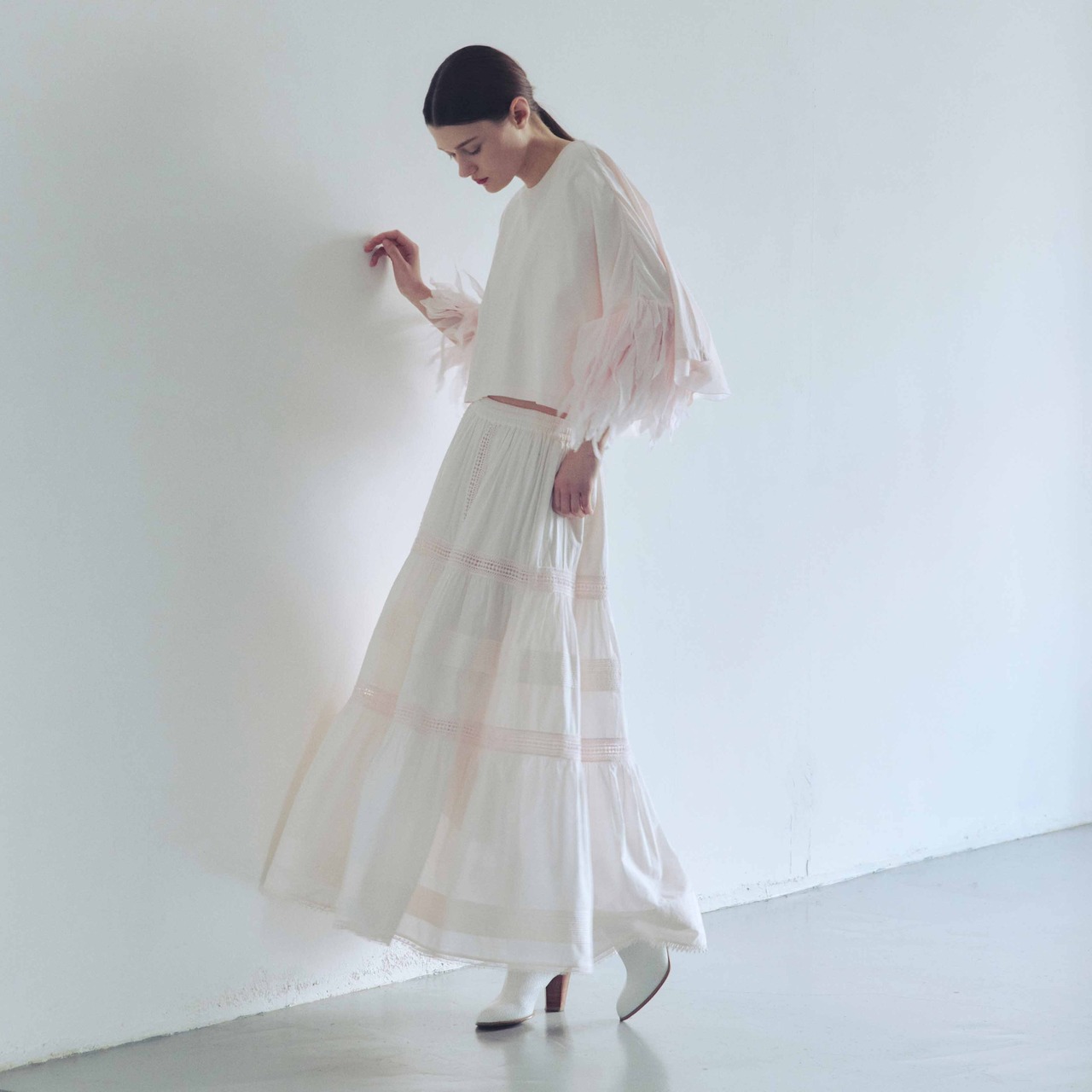 一番の魅力は、段ごとにあしらわれた繊細なレースと緻密なピンタックのディテール。歩くたびに444cmもの豊かな裾幅が空気をたっぷりと孕み、ドラマティックな揺らめきとともに、手仕事ならではの贅沢な表情を映し出します。透き通るような透明感がありながら、高品質な素材がもたらす優雅なドレープが、大人の女性にふさわしいクラス感を演出します。