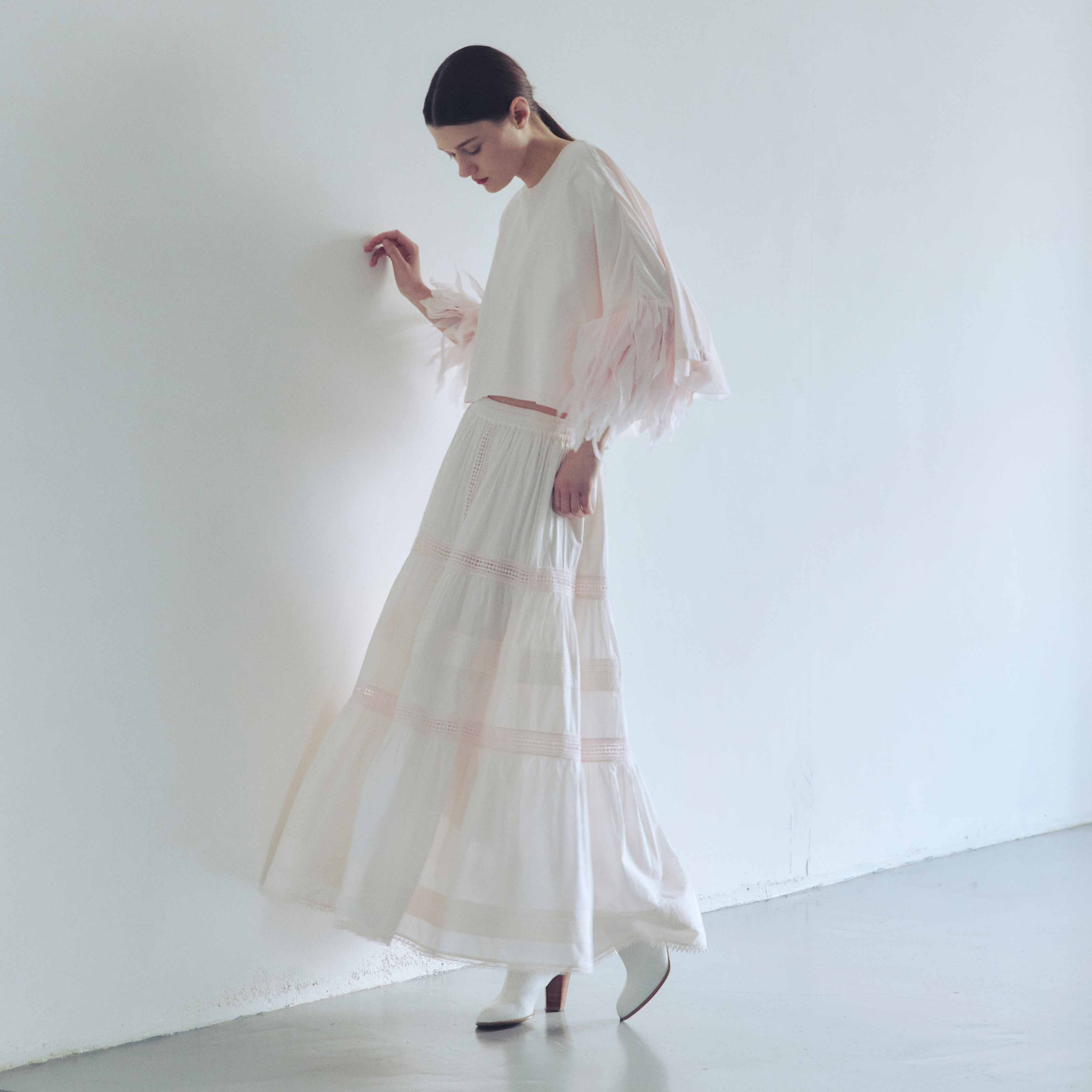 インドの熟練した技術が生み出す「ミルメイド」と呼ばれる、最高級の超長綿を贅沢に使用したティアードスカート。100番手の極細糸で織り上げられたこの素材は、コットンの軽やかさはそのままに、まるでシルクのような気品ある光沢を放ちます。